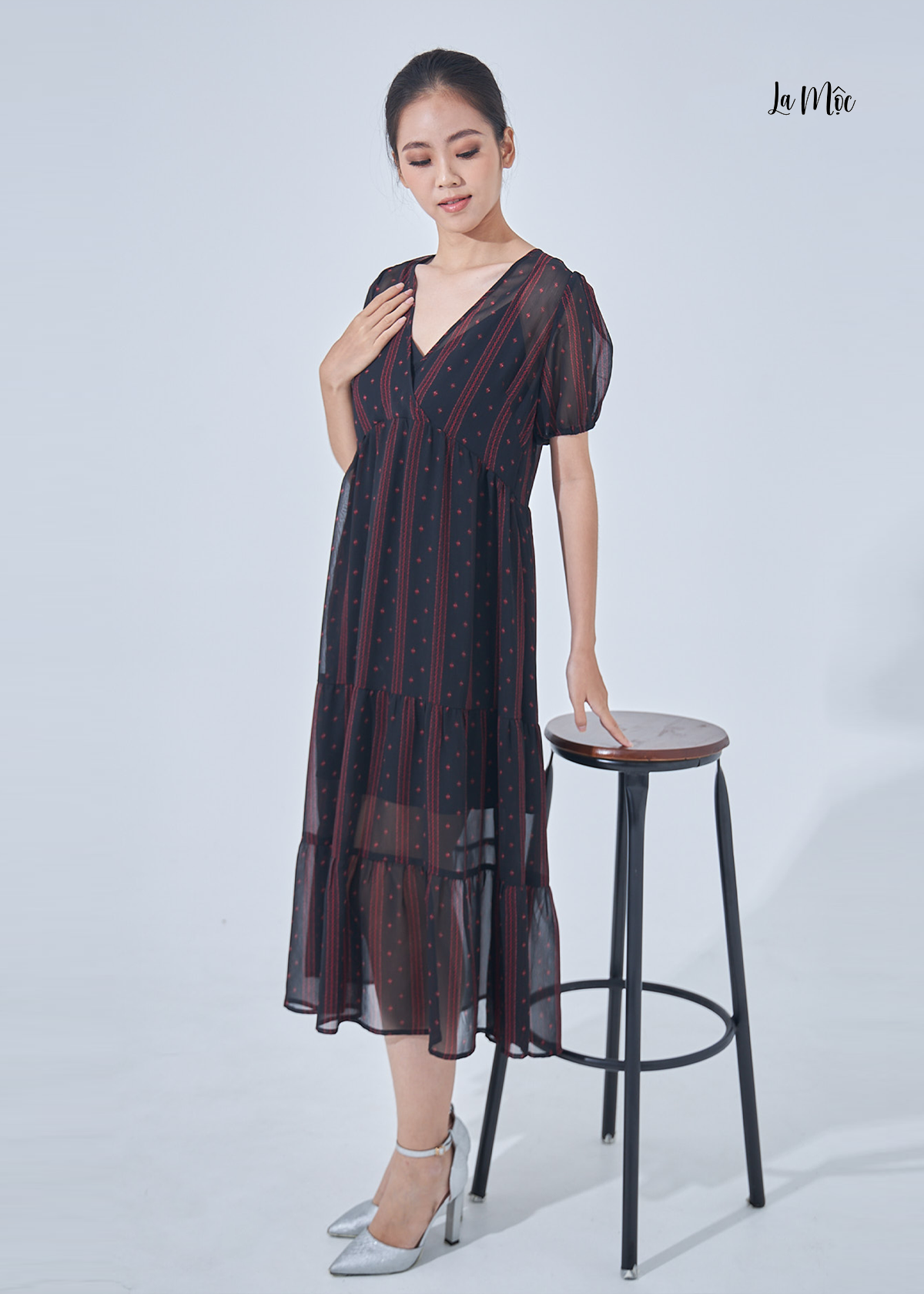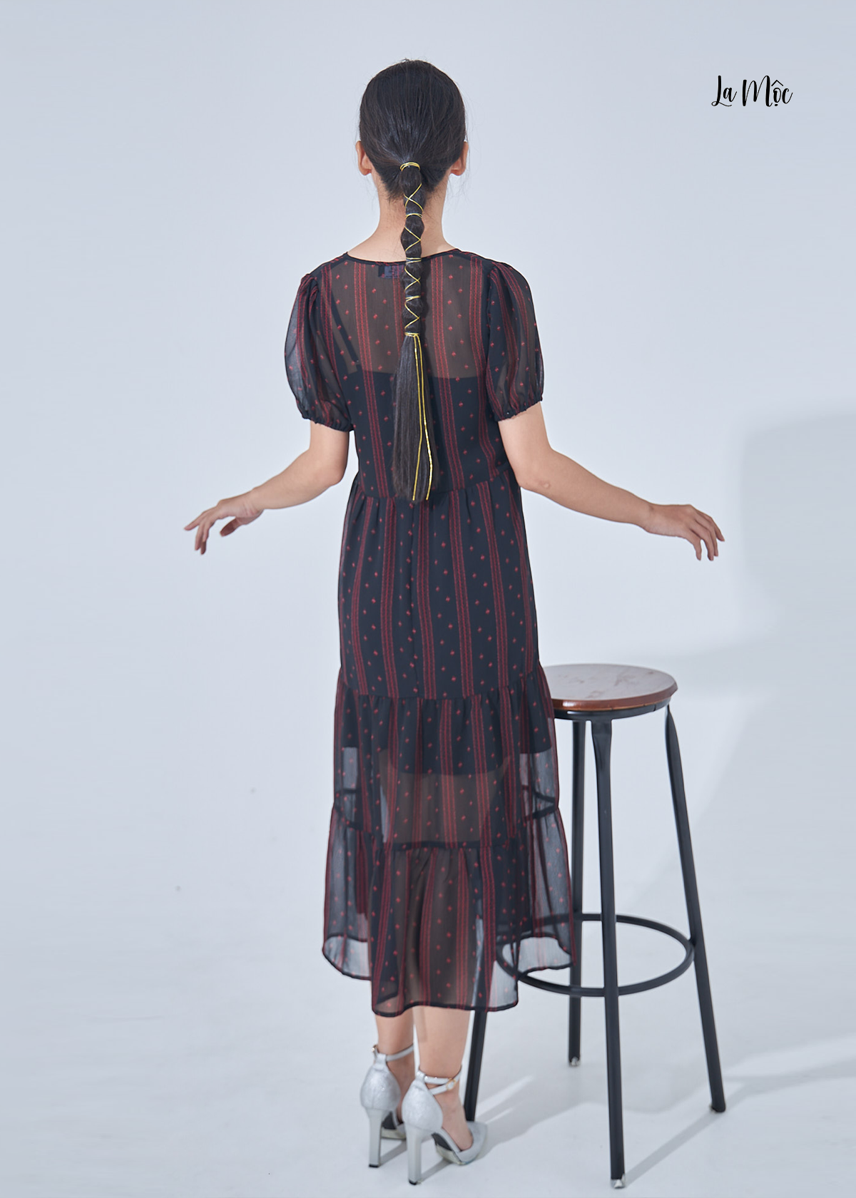 Đầm voan họa tiết mini sọc đỏ cổ chữ V, tay ngắn viền chun phồng nhẹ, chân váy nhún bèo 3 tầng. Đầm lót 2 dây: màu đen, cổ chữ V, phần váy ngắn trên gối.