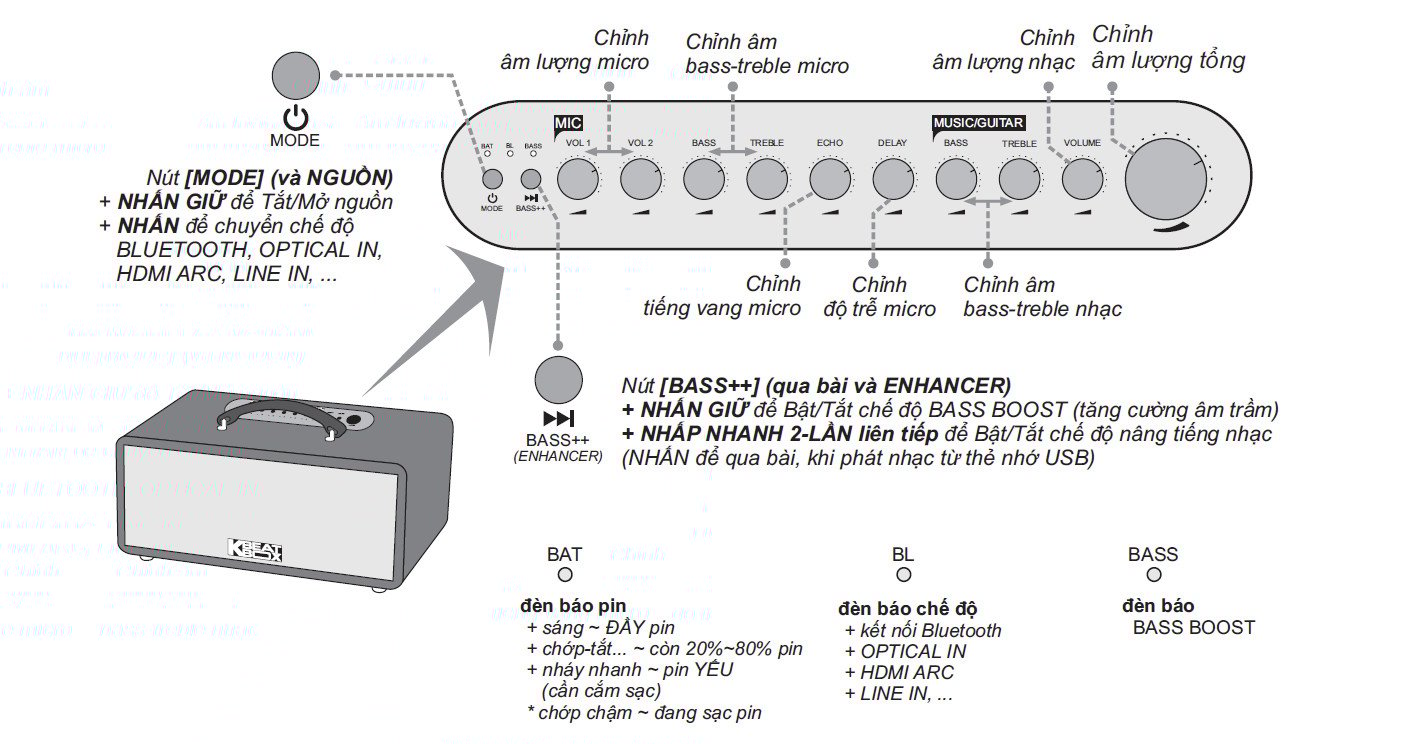 Cổng kết nối : MP3/OTG USB, HDMI ARC, OPTICAL IN, MIC / GUITAR (jack 6.35mm), LINE OUT / LINE IN (jack 3.5mm)