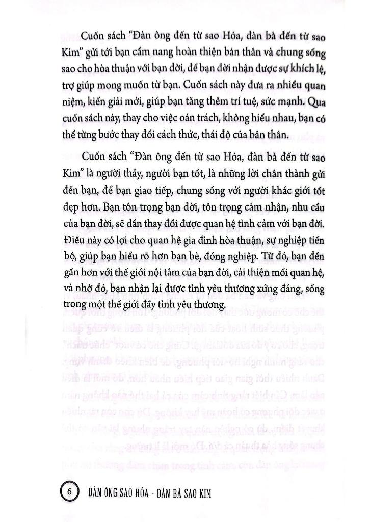 Hầu hết vấn đề xảy ra trong mối quan hệ giữa đàn ông và phụ nữ là kết quả của sự khác biệt tâm lý cơ bản giữa hai giới . Đối mặt với nó ra sao và giải quyết như thế nào luôn là mối quan tâm trăn trở của tất cả mọi người . Dù bạn đang yêu hay đã kết hôn , cuốn sách này sẽ đóng vai trò to lớn phân tích và đưa ra kỹ năng tôn trọng nhu cầu hay cảm nhận của đối phương , từ đó cải thiện mối quan hệ muôn thuở giữa "người sao Hoả " và " người sao Kim " .
