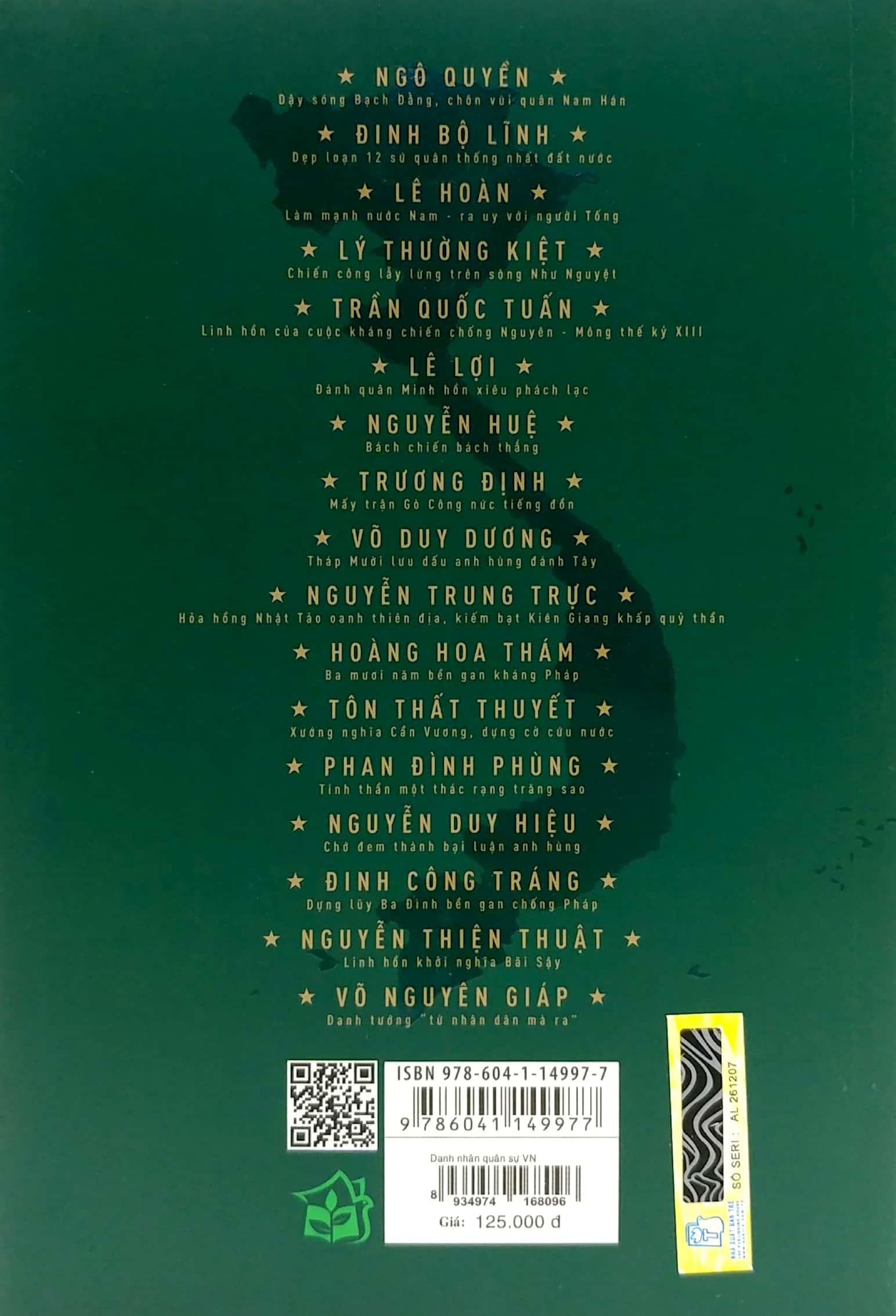 Danh Nhân Quân Sự Việt Nam Sách viết về 17 danh nhân quan sự Việt Nam: 1. Ngô Quyền, 2. Đinh Bộ Lĩnh, 3. Lê Hoàn, 4. Lý Thường Kiệt 5. Trần Quốc Tuấn,