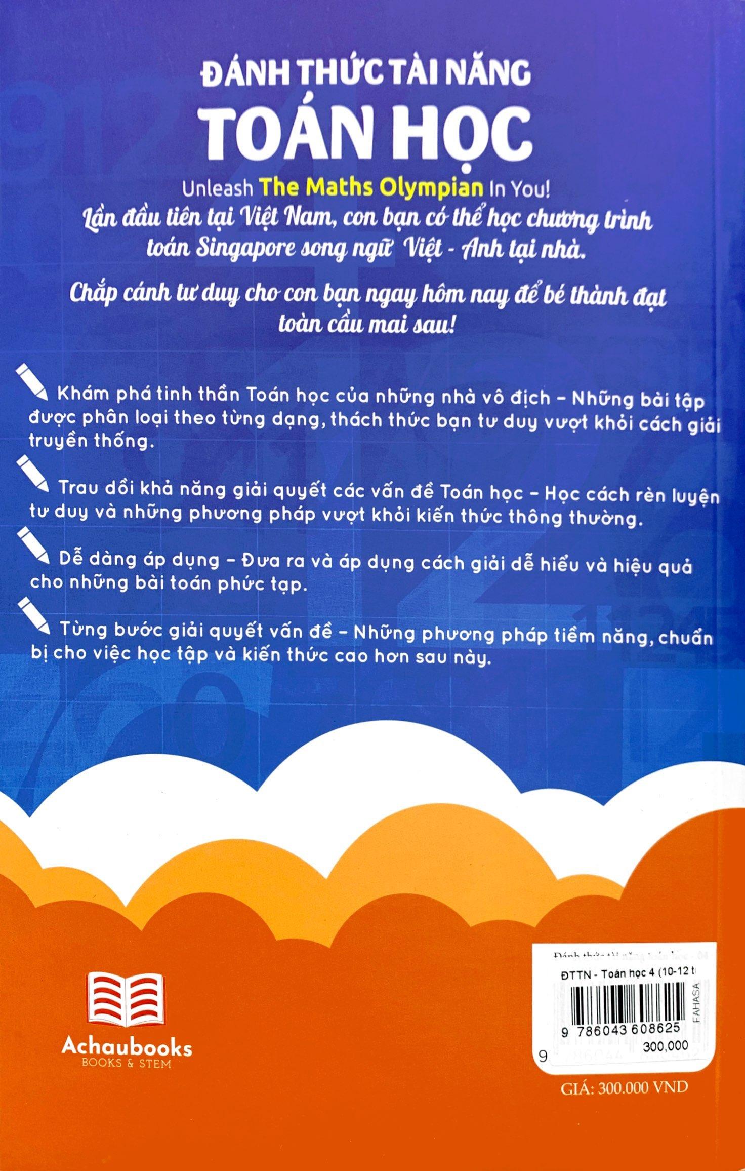 Đánh Thức Tài Năng Toán Học - Unleash The Maths Olympian In You! - Tập 4 (10-12 Tuổi) Điều gì đã khiến Singapore hơn 50 năm trước còn là một làng chài nhỏ, nghèo khổ mà nay đã vươn m.ình trở thành một trong những trung tâm tài chính - kinh tế quan trọng hàng đầu thế giới? Chìa khóa cho sự thành công đó chính là giáo dục. Trong đó, Toán là một trong những môn được tập trung đầu tư bởi giá trị mà Toán học đem lại không phải chỉ trong việc giải quyết những bài toán hay chứng minh những công thức; còn ở khả năng tác động tích cực đến trí não, hình thành tư duy logic, khả năng phân tích, sắp xếp và tính ứng dụng cao trong đời sống, xã hội. Và, một phần của điều này thể hiện trong bộ sách Toán ĐÁNH THỨC TÀI NĂNG TOÁN HỌC - UNLEASH THE MATHS OLYMPIAN IN YOU! của tác giả Terry Chew. Bộ sách sẽ đem đến cho các bạn học sinh: