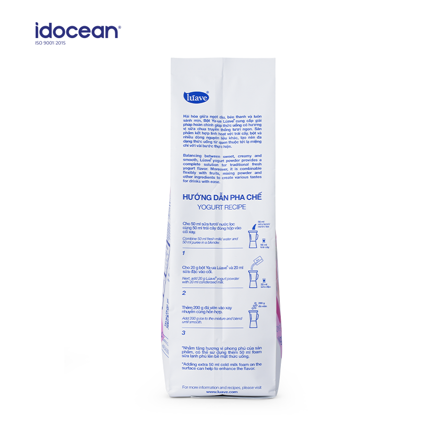 Bột Yogurt Lúave - Bột Ya-ua Lúave - 500g Đối với sữa chua thông thường khi dùng trong pha chế phải được bảo quản trong tủ lạnh, thời gian sử dụng ngắn. Chủ quán thường xuyên gặp phải sự cố hao hụt nguyên liệu, và đau đầu trong vấn đề giải quyết date sản phẩm. Vậy làm thế nào để đưa vị chua dịu, béo nhẹ của sữa chua vào các món sữa chua, đá xay mà vẫn tiện lợi và tối ưu giá thành. Câu trả lời chính là dùng Bột Yogurt Lúave. Bột Yogurt Lúave chuyên dùng trong pha chế các món sinh tố và đá xay, thay thế sữa chua thông thường, làm gia tăng hương vị béo dịu và đặc sắc cho ly sinh tố trái cây. ĐẶC ĐIỂM NỔI BẬT