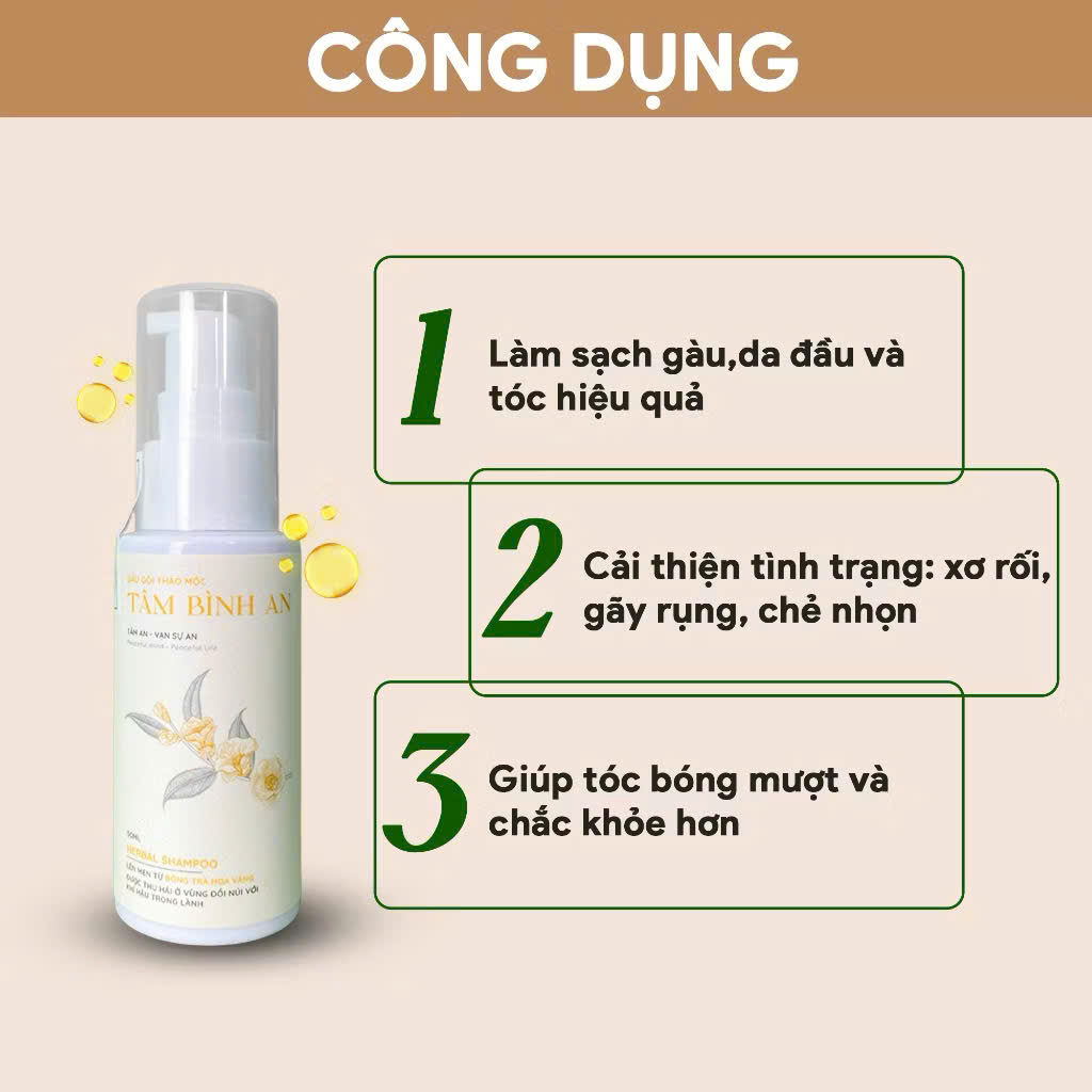 Mô tả: Dầu gội thảo mộc Tâm Bình An giữ tron tinh túy từ các nguyên liệu thiên, cung cấp dưỡng chất từ dược liệu quý Trà Hoa Vàng giàu chất EGCG chống oxy hóa, giảm viêm nhiễm, kích thích tuần hoàn máu, giảm ngứa, tóc mọc chắc khỏe, giảm gàu và mềm mượt. Giúp tóc và da đầu được bảo vệ bởi lớp màng ẩm và mang lại hương thơm thảo dược thiên nhiên. Ưu điểm: