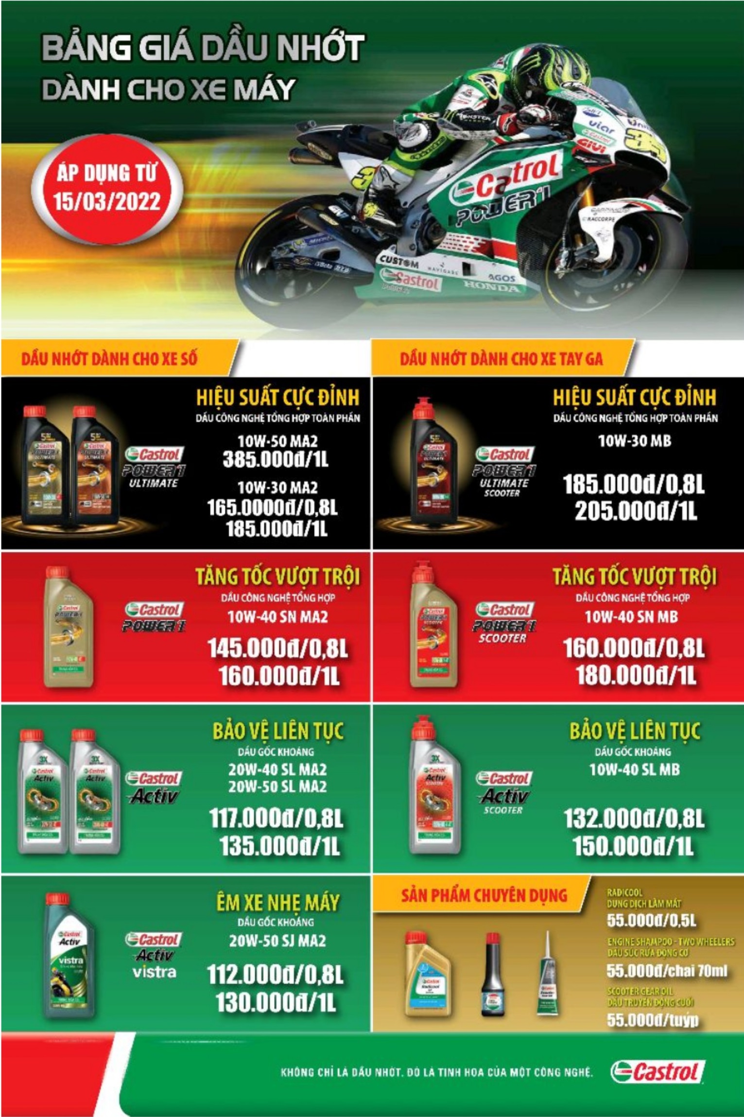Castrol POWER 1 Scooter 10W-40 Dầu nhớt cho động cơ xe tay ga thương hiệu Castrol Power 1 Scooter. Thể tích thực: 1000 ml (1 lít). Sử dụng cho các xe tay ga của các hãng xe phổ biến tại Việt Nam như: Honda SH, Honda SH Mode, Honda Lead, Honda AirBlade, Yamaha Grande, Nếu xe của bạn khuyến nghị 800 ml dầu nhớt thì ta chỉ đổ đủ 800 ml hoặc mua loại đóng chai 800mm.