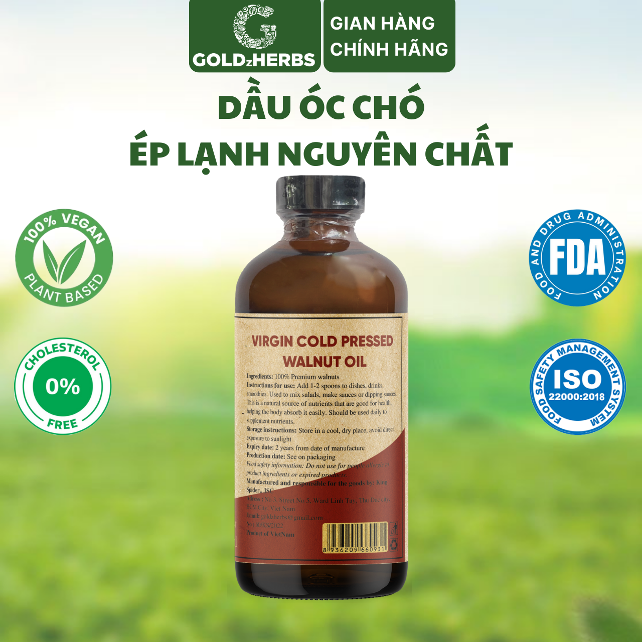 Dầu Óc Chó Ép Lạnh Nguyên Chất Goldzherbs được làm từ 100% Nhân hạt óc chó cao cấp được ép lạnh giữ tối đa màu sắc và hương vị thơm nhẹ rất dễ chịu.