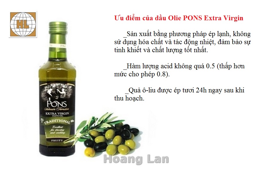 - Dầu Olive Extra Virgin PONS 1 lít - Tây Ban Nha (Chai nhựa) - _Thời hạn sử dụng: 30 tháng kể từ ngày sản xuất - _NSX, HSD: Xem trên bao bì. - _Thể tích thực: 1L ( Chai nhựa ) - _Xuất xứ: Euroaliment P.A.C., S.L.U (Tây Ban Nha) - - Đây là một loại chất béo được chiết xuất từ loại quả của cây Olive hay có tên quốc tế là Olea Europaea. Loại cây này là đặc sản mang tên tuổi của vùng đất Địa Trung Hải. Dầu Olive được sử dụng rộng rãi trong cuộc sống. Tuy nhiên được ưu tiên và chú trọng trong lĩnh vực mỹ phẩm, nấu ăn và dược liệu. - - _ Dầu Olive Extra Virgin PONS 250ml - Tây Ban Nha được sản xuất theo phương pháp ép lạnh, không đòi hỏi sử dụng hóa chất hay tác động nhiệt vào quy trình, giúp dầu giữ lại được các chất dinh dưỡng và có độ tinh khiết cao nhất. Vì vậy mà dầu Olive ép lạnh được nghiên cứu là mang lại nhiều lợi ích về sức khỏe hơn dầu Olive thông thường. - - _ Phần lớn chất béo chứa trong dầu Olive Pons Extra Virgin đều là chất béo không bão hòa rất tốt cho sức khỏe. Tiêu thụ chất béo không bão hòa giúp giảm khả năng mắc các bệnh tiểu đường loại 2, tim, ung thư và bệnh mãn tính. Dầu Olive ép lạnh cũng chứa ít nhất 30 hợp chất thực vật có lợi, nhiều chất chống oxy hóa mạnh có tác dụng chống viêm, hạ huyết áp, ngăn chặn sự phát triển của một số loại ung thư. Dầu Olive hoàn toàn có thể thay thế dầu ăn thông thường và là thực phẩm bổ sung lành mạnh. - - _Dầu có hàm lượng acid không quá 0.5o - - _Hương vị thơm ngon đậm đà hơn nhờ quả ô-liu được ép tươi ngay sau khi thu hoạch - - _Thành phần: Dầu Olive nguyên chất 100% được sản xuất theo phương pháp ép lạnh quả tươi ngay sau khi thu hoạch. -