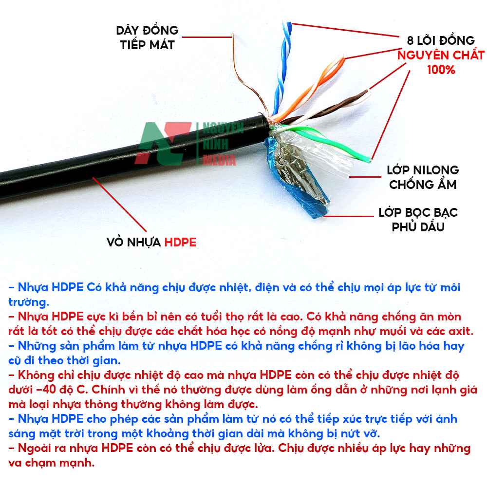 - Đường kính lõi đồng nguyên chất 100%: 0.51mm.(24 AWG)