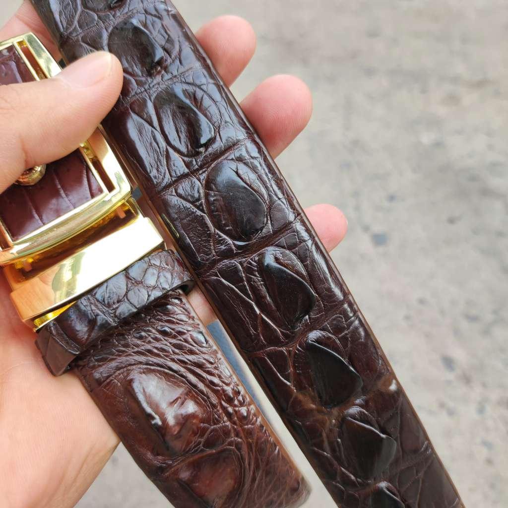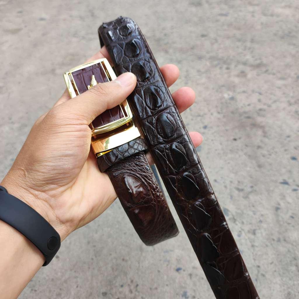 Thắt lưng da cá sấu nguyên con chạy từ gù cổ qua gai lưng đến vây đuôi của cá sấu. Mặt khóa tì tự động không rỉ sét.