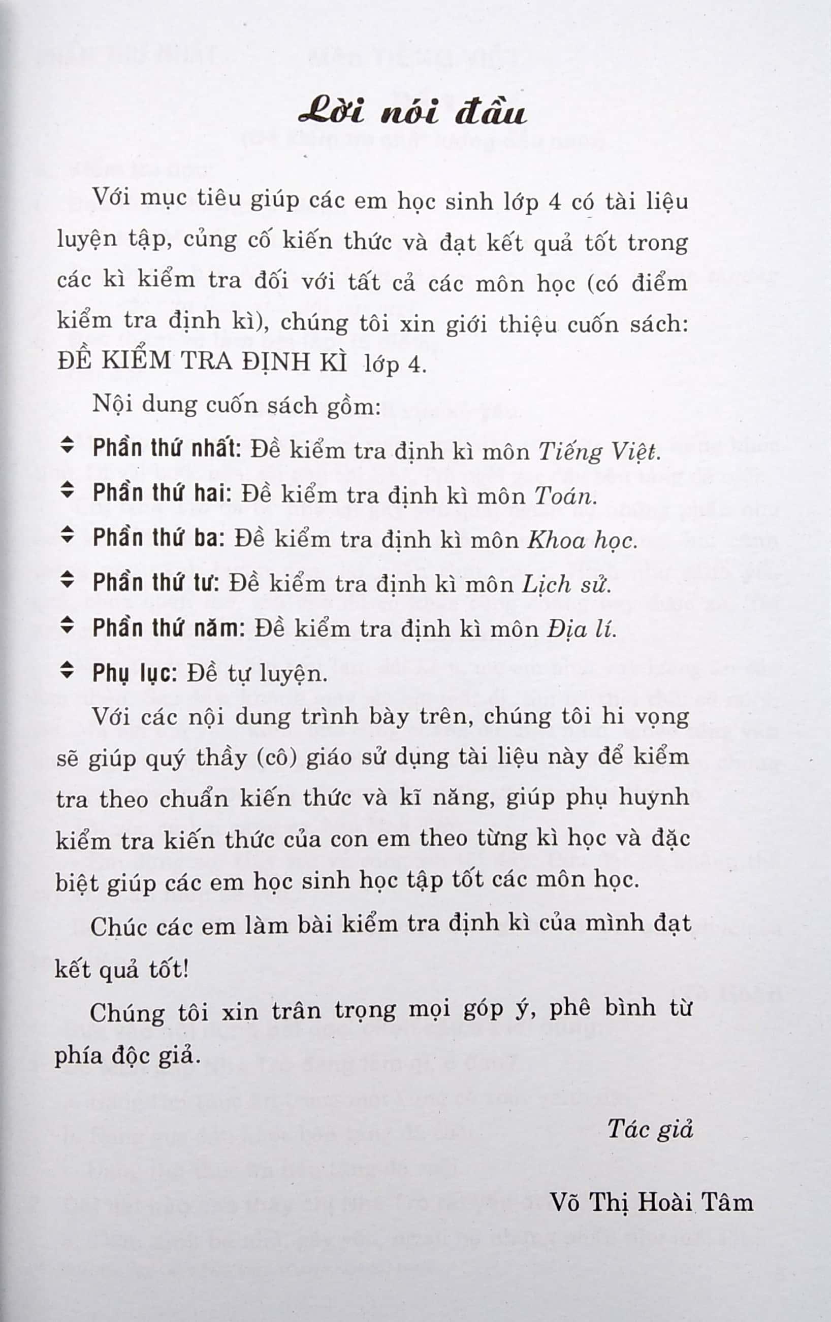 Lớp 4 cấp tiểu học, các em được tiếp nhận một chương trình học đa dạng và phong phú. Học tốt các môn học ở lớp 4, giúp các em có nền tảng vững chắc cho việc học tập ở các lớp trên. Để giúp các em có tài liệu ôn tập, củng cố kiến thức đã học và chuẩn bị tốt cho các đợt kiểm tra định kì, chúng tôi xin giới thiệu quyển sách: Đề Kiểm Tra Định Kỳ Tiếng Việt -Toán - Khoa Học - Lịch Sử - Địa Lý Lớp 4.