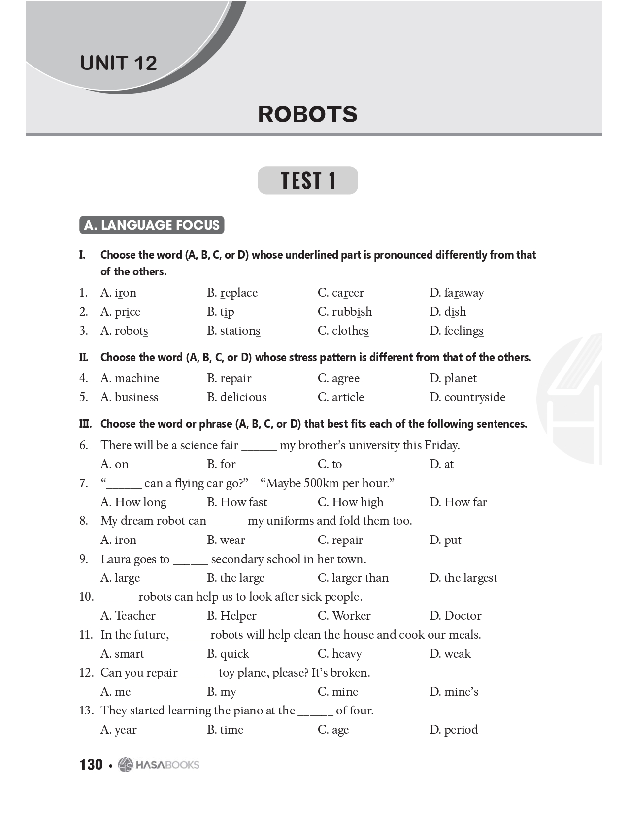 Nội dung các đề kiểm tra tập trung vào các kỹ năng và kiến thức trọng tâm, gồm các câu hỏi về phát âm, nhấn âm, từ vựng, ngữ pháp, tiếng Anh hội thoại, đọc hiểu và viết.