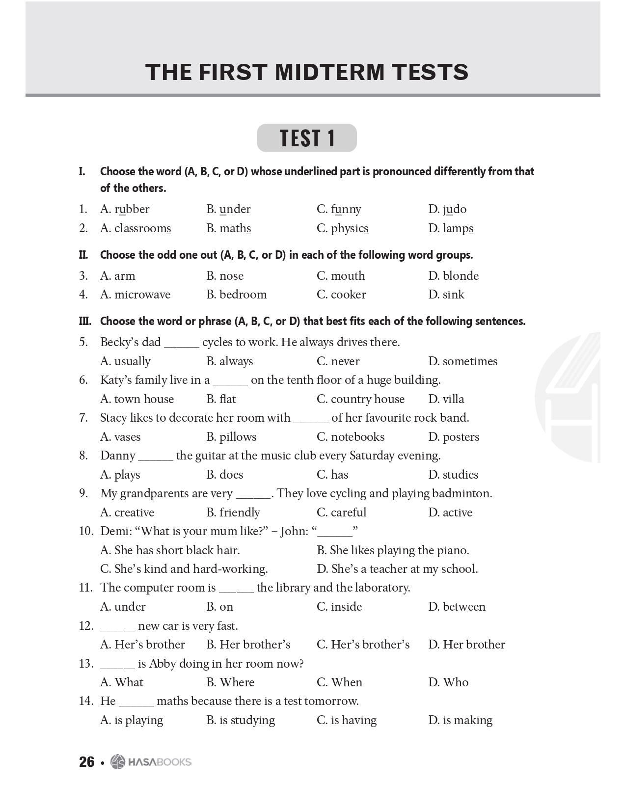 24 đề kiểm tra (Tests) tương ứng với 12 đơn vị bài học trong sách giáo khoa: củng cố kiến thức của từng đơn vị bài học, giúp học sinh chuẩn bị cho bài kiểm tra 15 phút.