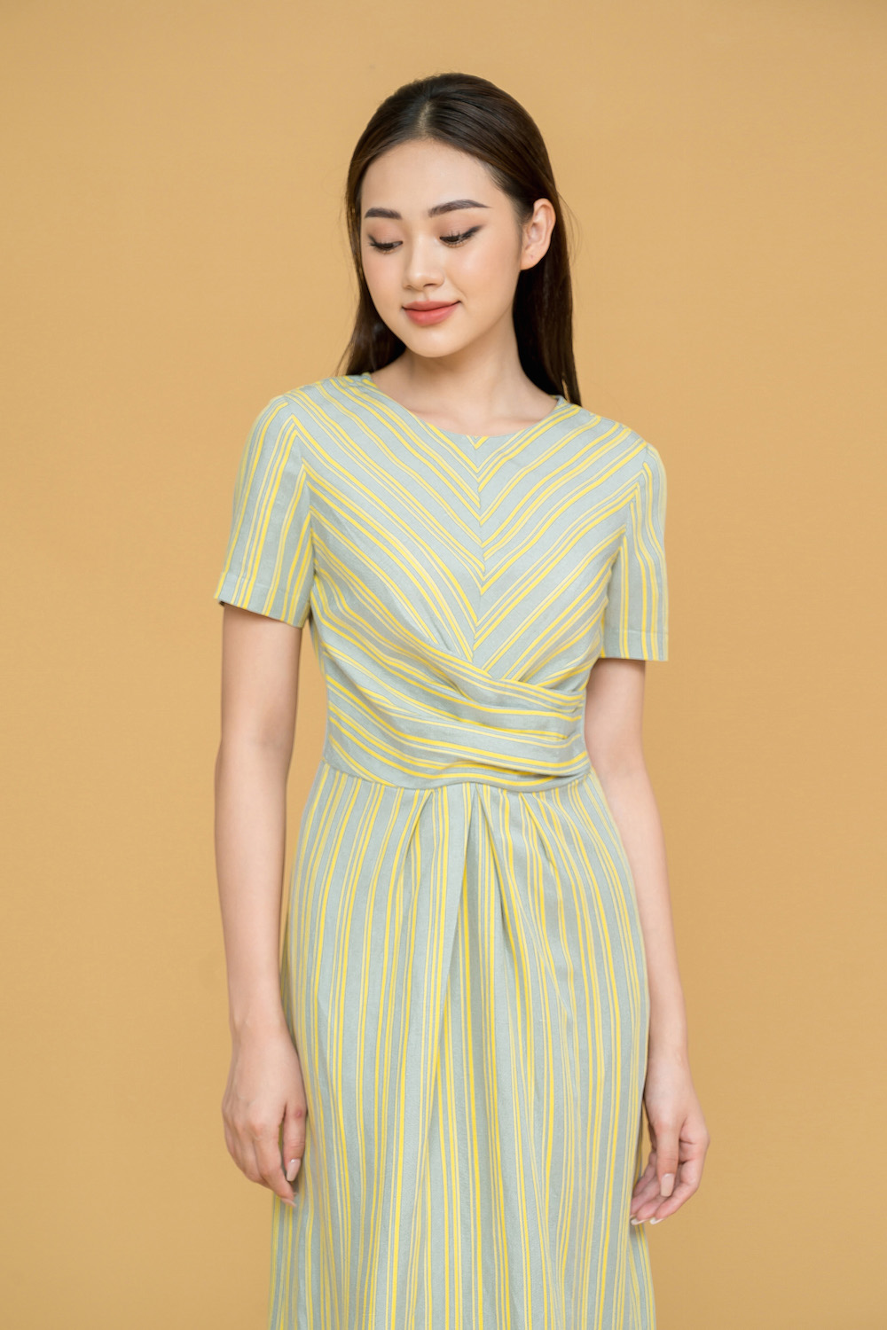 Đầm suông midi dáng dài, với vạt xoắn eo trẻ trung, cách điệu được cắt đối kẻ khéo léo, tinh tế. Chất liệu vải thô in hoạ tiết Hàn Quốc, mềm, mát. Tông mầu vàng