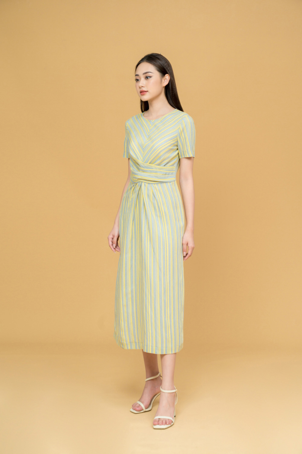 Đầm suông midi dáng dài, với vạt xoắn eo trẻ trung, cách điệu được cắt đối kẻ khéo léo, tinh tế. Chất liệu vải thô in hoạ tiết Hàn Quốc, mềm, mát. Tông mầu vàng ghi thời trang