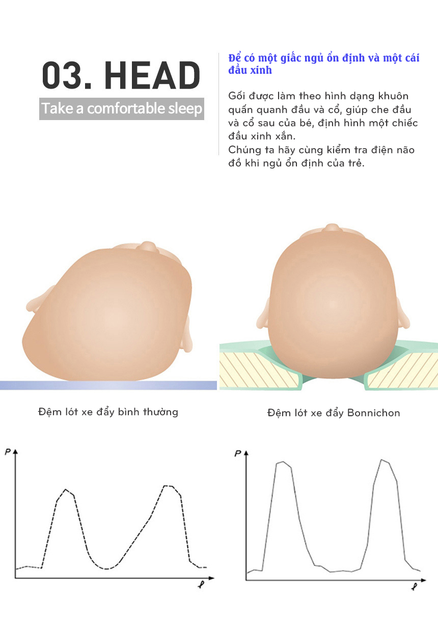 - Gối được làm theo hình dạng khuôn quấn quanh đầu và cổ, giúp che đầu và cổ sau của bé, định hình một chiếc đầu xinh xắn và sự ổn định khi ngủ cho bé