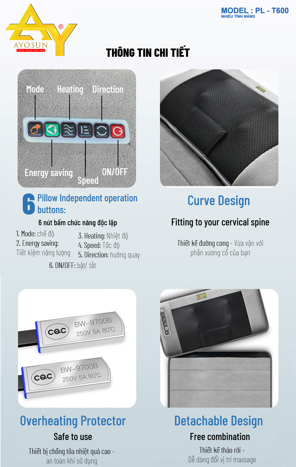 Giới thiệu nệm massage toàn thân aYosun PL - T600 - đệm massage toàn thân, rung xoa bóp nhào nặn có chế độ nhiệt hồng ngoại Đặc điểm nổi bật: nệm massage toàn thân
