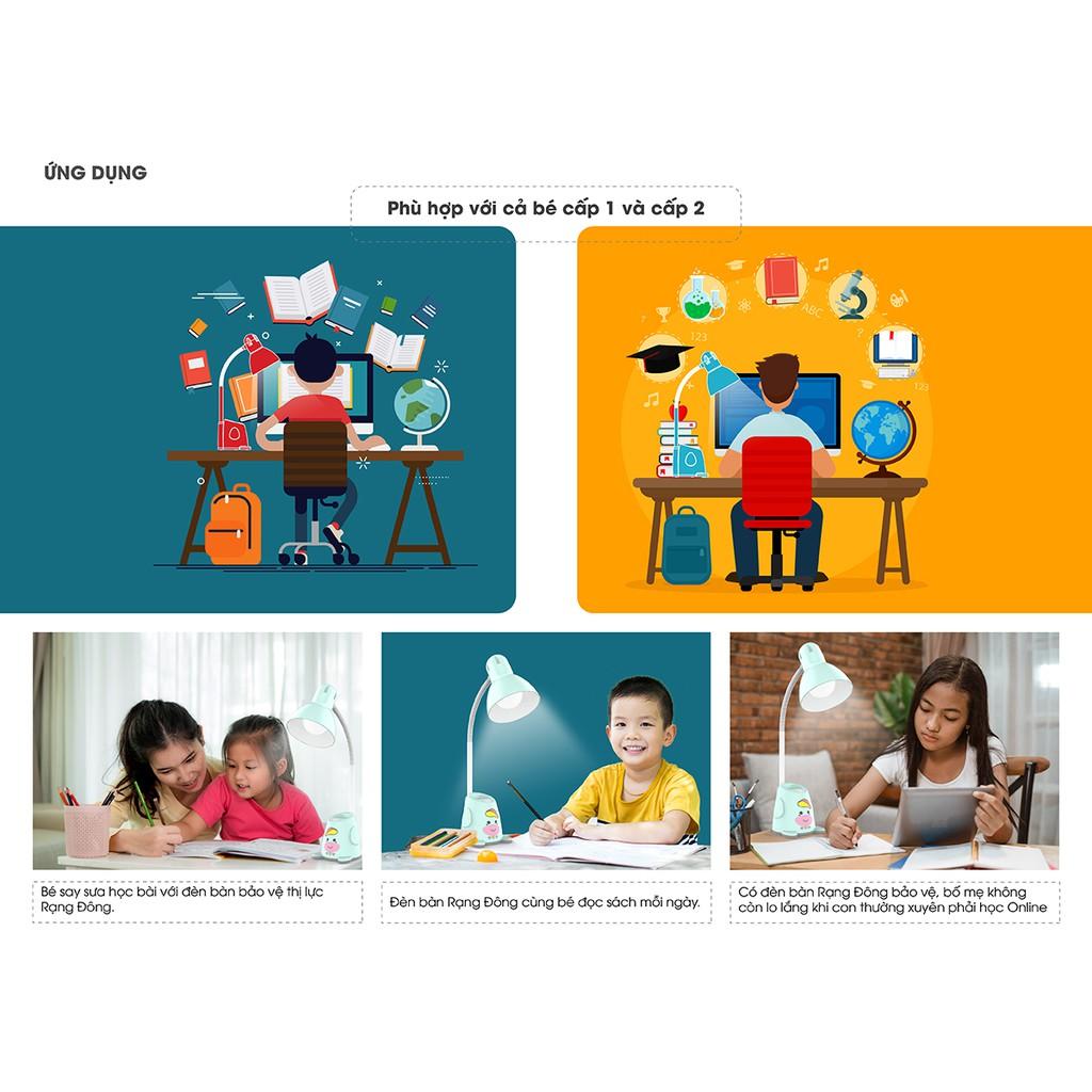 Đèn Bàn Rạng Đông Chống Cận LED 5W • Model: • Công suất: 5W/7W • Điện áp: 220V/50Hz • Nhiệt độ màu: 6500K (Trắng)/ Vàng(3000K)/ Đổi 3 màu ánh sáng • Màu đèn: Xanh/ Hồng