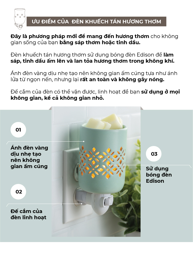 Đèn khuếch tán hương thơm sử dụng bóng đèn Edison để làm sáp ấm lên và tan chảy trong đĩa, từ đó lan tỏa hương thơm trong không khí. HƯỚNG DẪN SỬ DỤNG