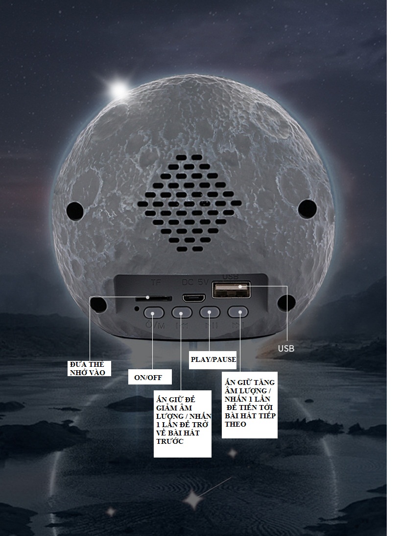 Kích thước : 19 x 17 cm Dung lượng pin sạc : 1200 mAh Công suất : 5W Lỗ cắm USB Lỗ cắm thẻ nhớ Đèn đổi màu theo điệu nhạc