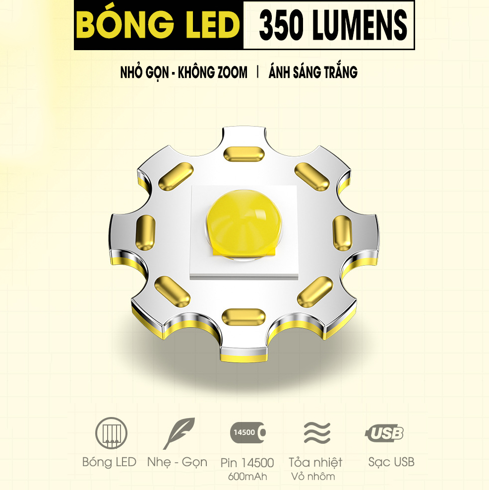 - Pin: pin lithium 600mAh (pin 14500), cho thời gian sử dụng 2h tùy thuộc vào chế độ sáng