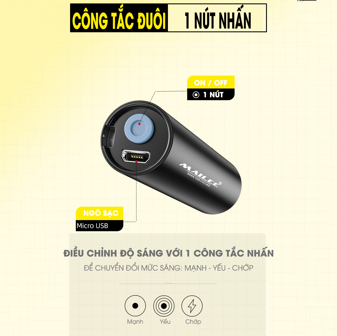 - Đèn gồm 3 chế độ sáng: mạnh - yếu - chớp