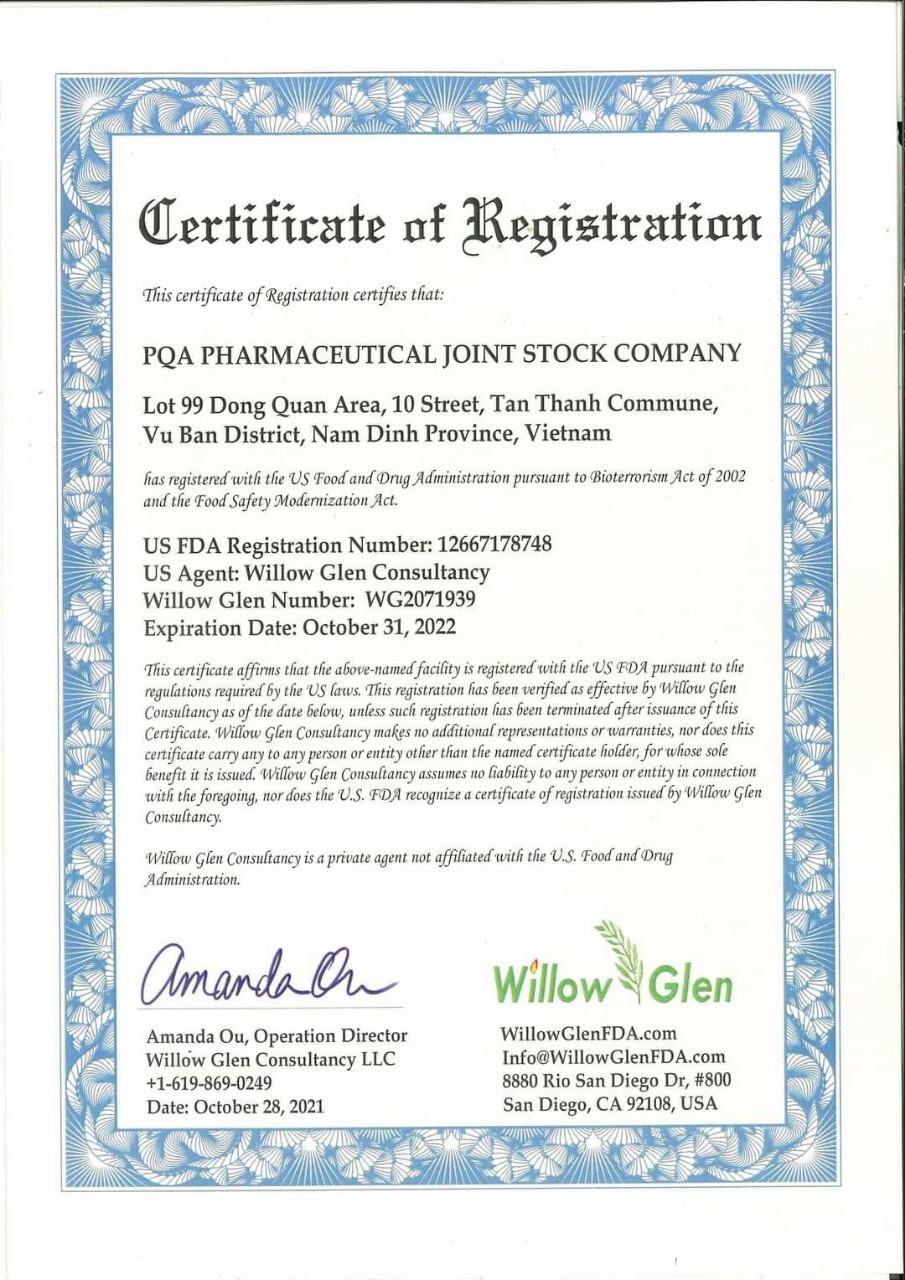- Địa chỉ sản xuất: Công ty Cổ phần Dược phẩm PQA. Thửa 99, Khu Đồng Quàn, Xã Tân Thành, Huyện Vụ Bản, Tỉnh Nam Định.