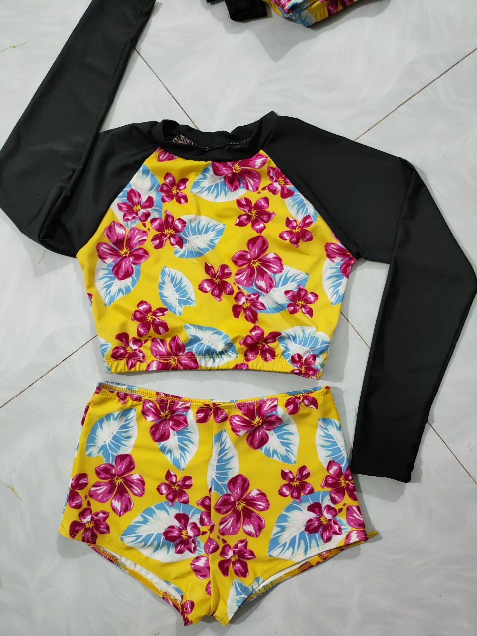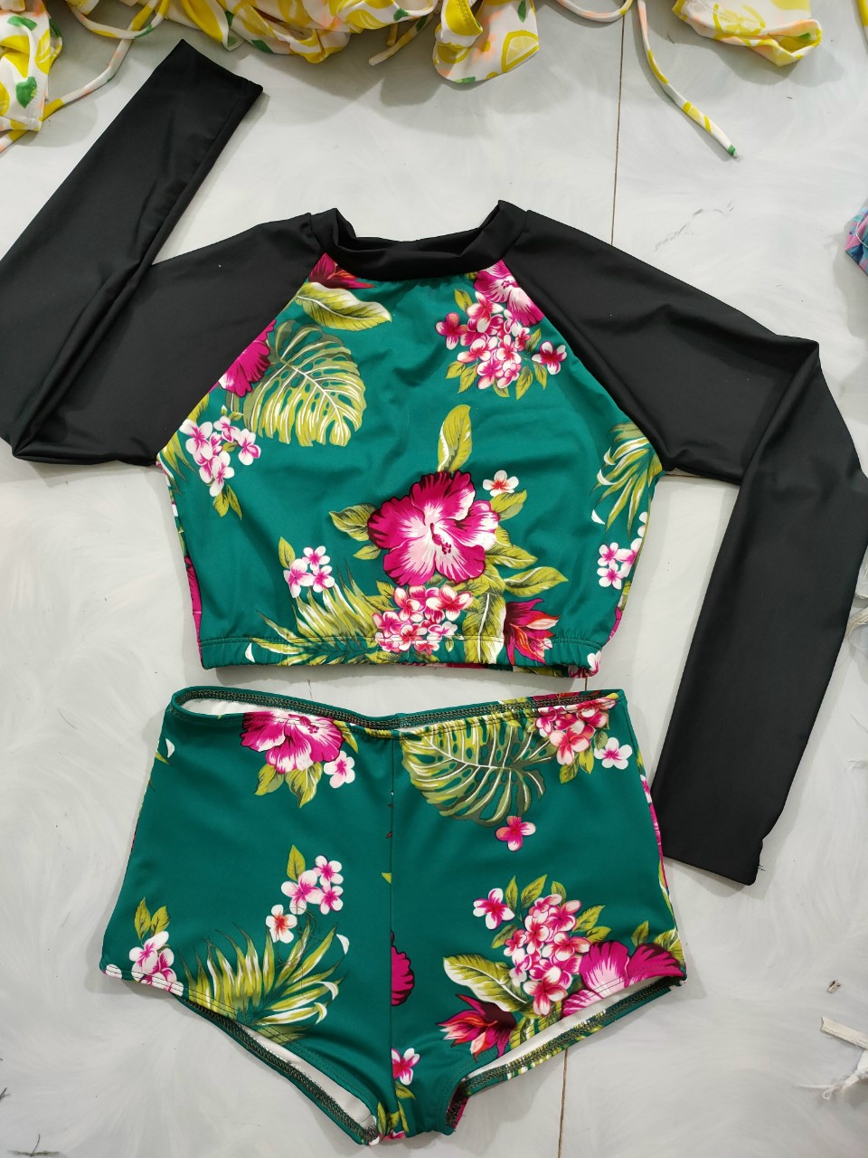 - Mẫu đồ bơi mới nhất cho các bạn nữ thích sự trẻ trung kín đáo mà vẫn thu hút khi đi biển, đi bơi. - Áo dáng ngắn tay phối hoạ tiết trẻ khoẻ,