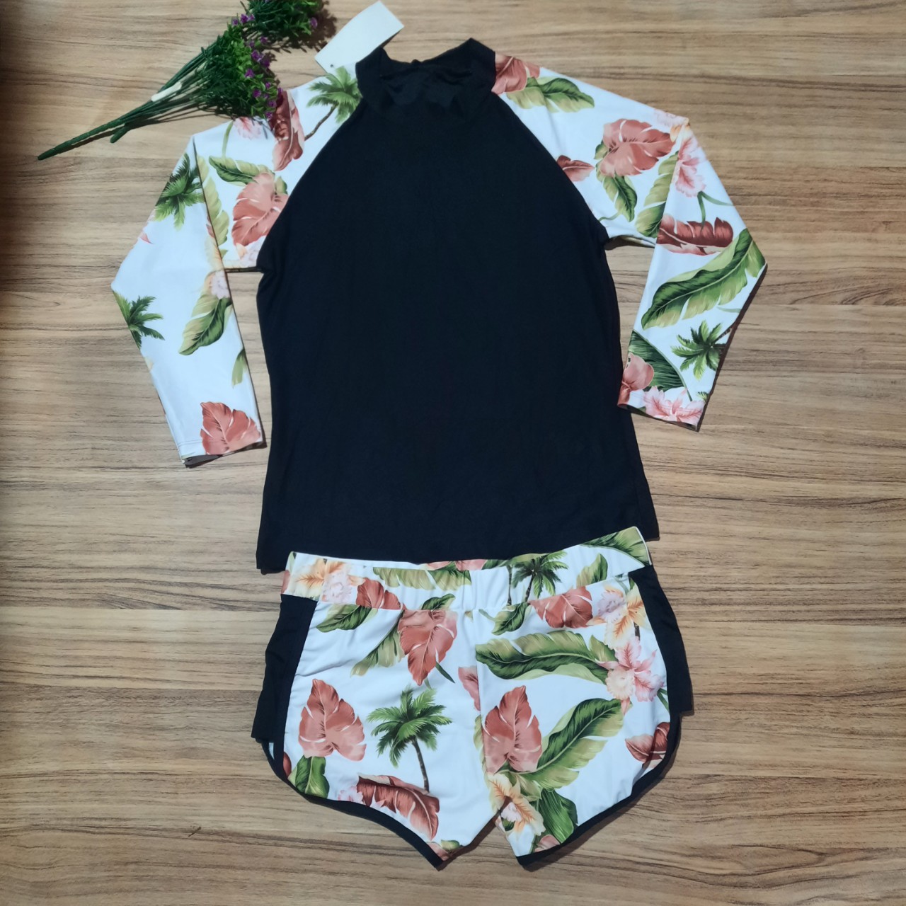 - Mẫu đồ bơi mới nhất cho các bạn nữ thích sự trẻ trung kín đáo mà vẫn thu hút khi đi biển, đi bơi. - Áo dáng ngắn tay phối hoạ tiết trẻ khoẻ,