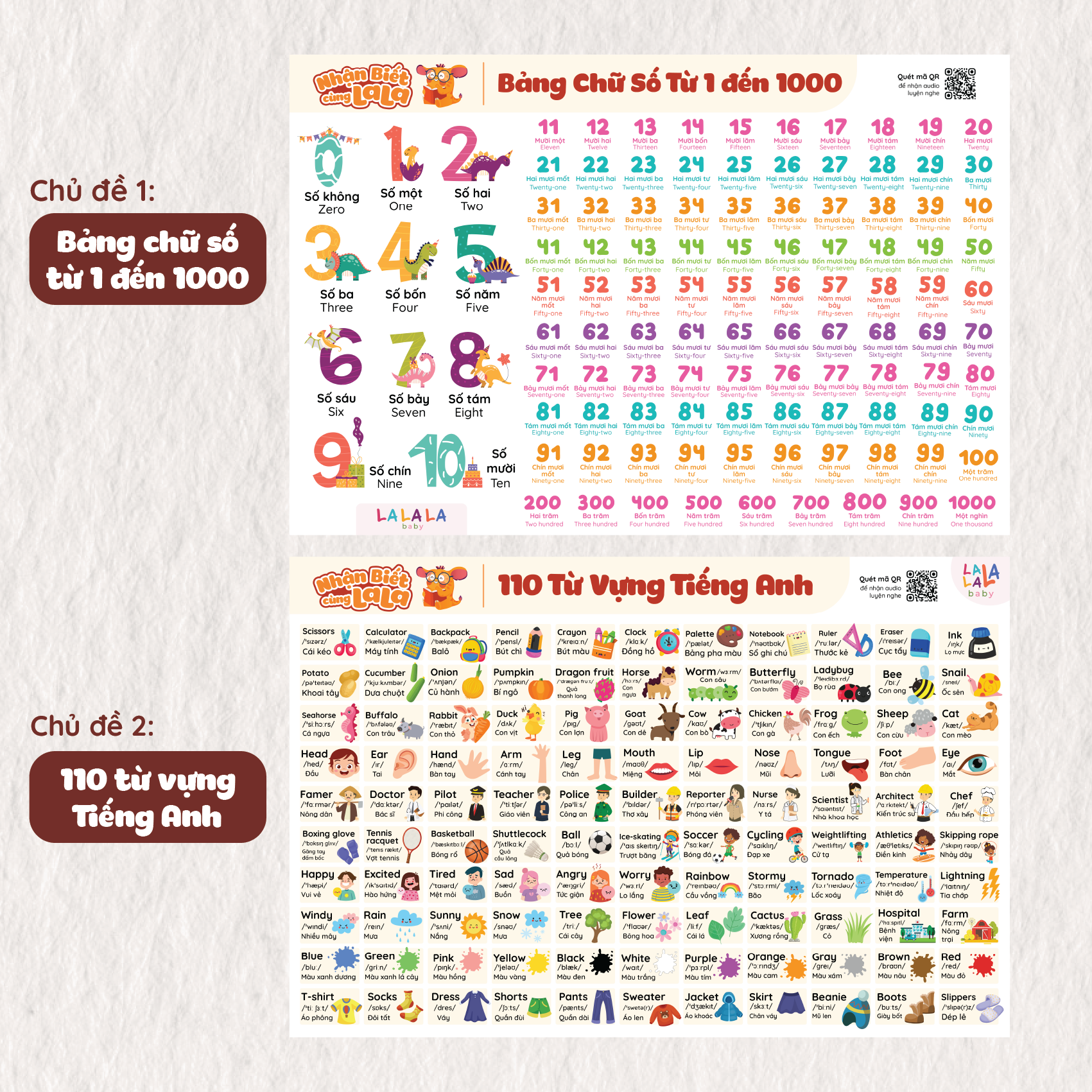 ✨Đồ Chơi Giáo Dục - Poster Dán Tường (Không Keo Dính) Song Ngữ Anh Việt - Bảng Chữ Cái - Chữ Số - Cửu Chương - Động Vật - Lalala baby