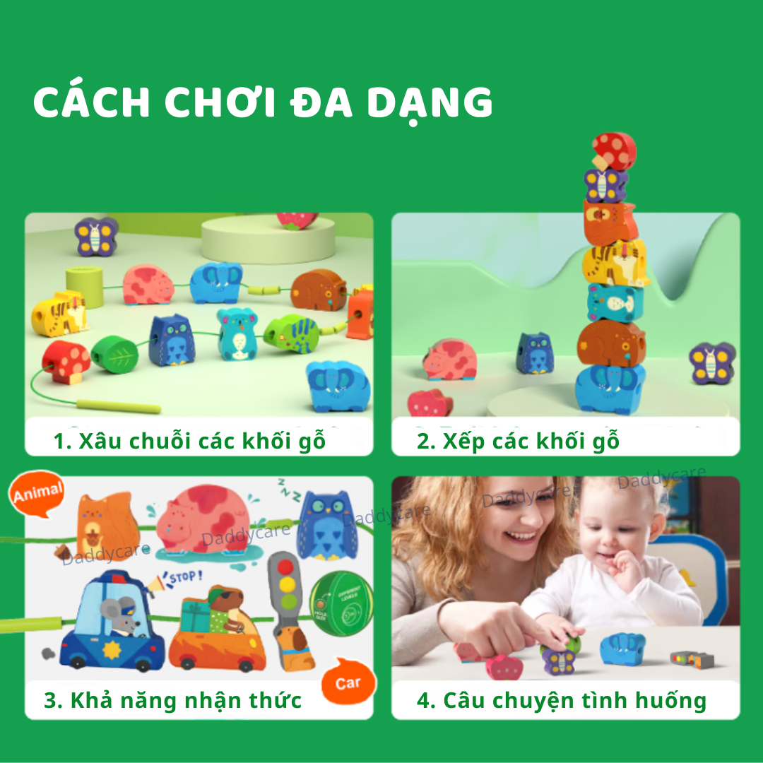 - XÂU CÁC KHỐI GỖ – CẢI THIỆN SỰ PHỐI HỢP TAY VÀ MẮT: Khi bé tập trung luồn dây qua các khối gỗ, sự khéo léo của ngón tay sẽ được rèn luyện, hỗ trợ phát triển khả năng tập trung và tư duy logic.