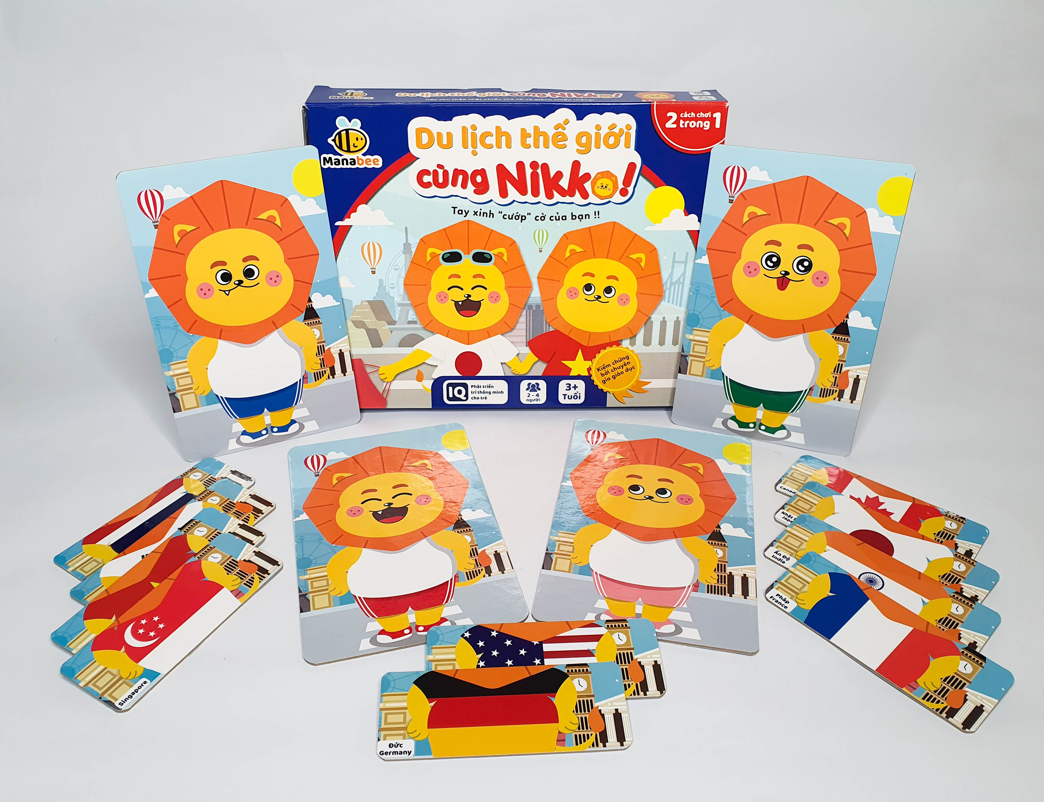 “Du lịch thế giới cùng Nikko!” là bộ trò chơi tương tác giúp phát triển các kỹ năng tư duy và phát triển IQ - Chỉ số thông minh cho các bạn nhỏ. Thông qua việc bốc những tấm thẻ đầy màu sắc và giúp các bạn sư tử mặc áo, trẻ sẽ được làm quen về màu quốc kỳ của các nước cũng như rèn luyện khả năng ứng xử, tư duy logic rất tốt. Các nhân vật là những chú sư tử tinh nghịch, hài hước và được minh họa đẹp mắt chắc chắn cũng sẽ mang lại nhiều tiếng cười cho bé.