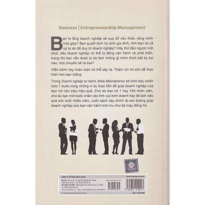 Bạn lo lắng doanh nghiệp sẽ sụp đổ nếu thiếu vắng mình một giây? Ban quyết đinh hy sinh gia đình, tình bạn và cả sự tự do để duy trì doanh nghiệp? Hãy thử đảo ngược một chút, nếu doanh nghiệp có thể tự động vận hành và phát triển, trong khi bạn có thể tự do làm những gì mình thích bất kỳ lúc nào, mọi chuyện sẽ ra sao? Viễn cảnh này hoàn toàn có thể xảy ra. Thậm chí nó còn dễ dàng thực hiện hơn bạn tưởng tượng. Trong Doanh nghiệp tự hành, Mike Michalowicz trình bày kết quả của sáu năm nghiên cứu cùng những ví dụ thực tiễn để giúp doanh nghiệp trở nên siêu-hiệu-quả. Ngoài những chiến lược tuyệt diệu, cuốn sách còn giúp bạn khám phá cách: • Khiến nhân viên hành động như người làm chủ: Giải phóng bạn khỏi “xiềng xích” quản lí vi mô bằng một kĩ thuật đơn giản, trao quyền để nhân viên đưa ra những quyết định thông minh mà không cần có bạn. • Xác định chức năng quan trọng nhất của doanh nghiệp: Gỡ bỏ trói buộc ngăn bạn đạt được hiệu quả thần kì bằng cách xác định và tập trung nguồn lực của vào chức năng trọng yếu nhất. • Biết mình cần phải xử lý vấn đề gì tiếp theo: Các doanh nghiệp thường cố gắng sửa chữa tất cả thiếu sót cùng một lúc, để rồi nhận ra mình chẳng thay đổi được gì. Hãy tận dụng phương pháp “mắt xích yếu nhất” để tìm ra khuyết điểm cần khắc phục có thể mang đến bước chuyển mình cho công ty! Nhận xét của độc giả uy tín: “Nếu có một vị thánh bảo trợ cho các doanh nhân, Mike Michalowicz chắc chắn là ứng cử viên hàng đầu. Anh ấy đã trực tiếp đi qua mọi đỉnh của chuyến tàu lượn siêu tốc dành cho doanh nhân. Vậy nên anh ấy luôn trung thực trình bày những kinh nghiệm bản thân đã trải qua – những điều các doanh nhân muốn nghe. Không câu từ hoa mỹ, không lý thuyết suông như các cuốn sách khác, Doanh nghiệp tự hành đầy ắp những lời khuyên thực tế và dễ hiểu. Nó nhắc nhở các doanh nhân nhớ về lý do tại sao họ bắt đầu cuộc phiêu lưu và cung cấp cho họ một bộ công cụ để mang bên mình.” _ Simon Sinek, tác giả cuốn Bắt đầu với câu hỏi tại sao và Leaders Eat Last (tạm dịch: Lãnh đạo ăn cuối cùng) “Doanh nghiệp tự hành là bản hướng dẫn giúp các chủ doanh nghiệp nhỏ đạt được mục đích khi họ muốn sở hữu một doanh nghiệp - thời gian và tự do tài chính!” _Gino Wickman, tác giả của mô hình EOS "Khi doanh nghiệp của bạn vận hành trơn tru như máy đồng hồ, bạn cuối cùng cũng có thể thoát lý khỏi doanh nghiệp. Trong cuốn sách thú vị này, Mike sẽ giúp bạn đạt được ước mơ đã thúc đẩy bạn thành lập doanh nghiệp từ thuở ban đầu." _Laura Vanderkam, tác giả Người thành công làm gì trước bữa sáng "Doanh nghiệp tự hành dạy bạn cách làm chủ doanh nghiệp chứ không phải quản lý doanh nghiệp. Nó sẽ giúp bạn có thêm nhiều thời gian hơn, dòng tiền dồi dào hơn và tự do đắm chìm trong những ý tưởng. Tôi đánh giá cao chiến lược này." _Donald Miller, tác giả Xây dựng câu chuyện thương hiệu "Bạn cảm thấy mình đang bị quá tải trong công việc? Nhiều chủ doanh nghiệp – nếu không muốn nói là phần lớn, dường như khó có thể vượt lên cơn sóng những việc cần làm. Nếu có thể đứng từ xa thiết kế doanh nghiệp và tập trung vào những phần việc bạn thực sự muốn, mọi thứ sẽ ra sao? Trong cuốn sách mới nhất của mình, Mike Michalowicz đã xây dựng kế hoạch 7 bước để hiện thực hóa mong muốn đó. Hãy đọc Doanh nghiệp tự hành và bắt đầu những bước đầu tiên giành lại cuộc sống chẳng có nhiều gánh nặng của mình.” _Daniel H. Pink, tác giả Động lực chèo lái hành vi, Một tư duy hoàn toàn mới và Khi nào – bí mật khoa học của thời điểm hoàn hảo Về tác giả: Mike Michalowicz là một tác giả, doanh nhân và giảng viên người Mỹ. Ông là tác giả của nhiều cuốn sách kinh doanh nổi tiếng như: Khởi nghiệp từ khốn khó, Kế hoạch Bí ngô và là cựu chuyên gia kinh doanh tại Wall Street Journal. Ông là người dẫn chương trình “Giải cứu doanh nghiệp” cho MSNBC’s Your Business. Ông đã tổ chức chương trình thực tế có tên là Ballout! Ông tham gia viết bài cho Tạp chí Doanh nhân và là người phụ trách chuyên mục “Diễn đàn mở” của Ameriacan Express. Ông cũng xuất hiện trên NBC, MSNBC, Fox News, ABC News  Ông tổ chức giảng dạy về các kỹ năng kinh doanh, bán hàng, tiếp thị hành vi tại các trường đại học, tập đoàn và tổ chức.