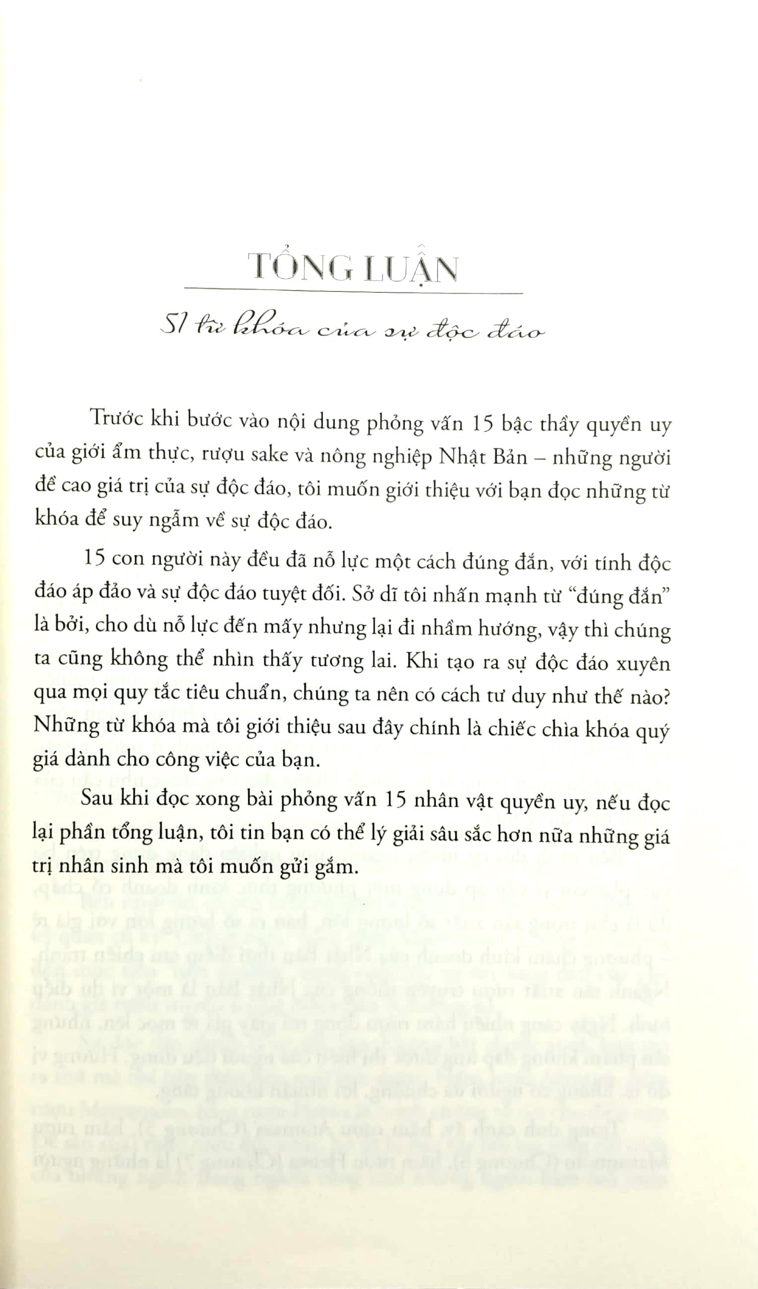 Độc Tôn Để Trường Tồn 51 bí quyết tạo dựng vị thế độc tôn trong lĩnh vực kinh doanh ẩm thực Cuộc đời của con người chỉ kéo dài khoảng 100 năm, và thời đại mà bất cứ ai cũng phải làm việc đến 70-80 tuổi đang nhăm nhe tấn công chúng ta. Nếu muốn tận hưởng một cuộc đời trọn vẹn, muốn trải qua mỗi ngày trong vui vẻ, vậy thì sở hữu một công việc độc đáo mà chỉ m.ình bạn mới làm được sẽ là chìa khóa quan trọng hơn tất thảy, dù với mục đích kiếm tiền hay bất cứ mục đích nào đi nữa. Thông qua cuốn sách này, tác giả sẽ giới thiệu cho chúng ta những công việc thấm đẫm triết lý của sự độc đáo của 15 nhân vật hoạt động năng nổ trong ngành ẩm thực, rượu sake và nông nghiệp Nhật Bản.