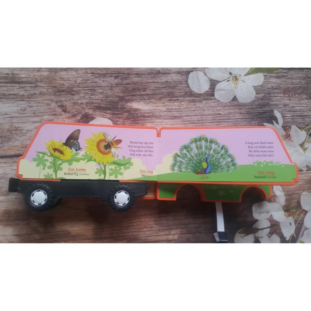 Mỗi cuốn sách là một chiếc ô tô nhỏ có bánh đà giúp các bé vừa học vừa chơi; đặc biệt các bạn nhỏ lứa tuổi mầm non (0-6 tuổi) có thể học hỏi, nhận biết về các chữ cái, chữ số, các loại trái cây, muông thú, phương tiện giao thông; cách đọc, viết các sự vật/ đồ vật/ con vật đó bằng tiếng Việt, tiếng Anh.
