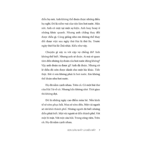 "Đơn giản nhất là biến mất" là tập truyện ngắn chủ yếu xoay quanh K, nhân vật xuất hiện ở nhiều nơi, trong nhiều câu chuyện, đôi khi như một nhân chứng, đôi khi chỉ là một bóng dáng. Không có gì rõ ràng về K, cũng không có gì thực sự cố định trong những mẩu chuyện này, chúng có thể là những giấc mơ, những ký ức, hoặc những cuộc hội thoại dang dở. Thành phố, căn phòng, bến tàu trong tập truyện có thể là bối cảnh cho một cuộc chia ly hoặc một cuộc gặp. Ở đó, có những người đã rời đi từ rất lâu, những lời hứa không ai nhắc lại. K không nói nhiều, hoặc có thể K đã từng nói, nhưng chẳng ai nhớ nổi.