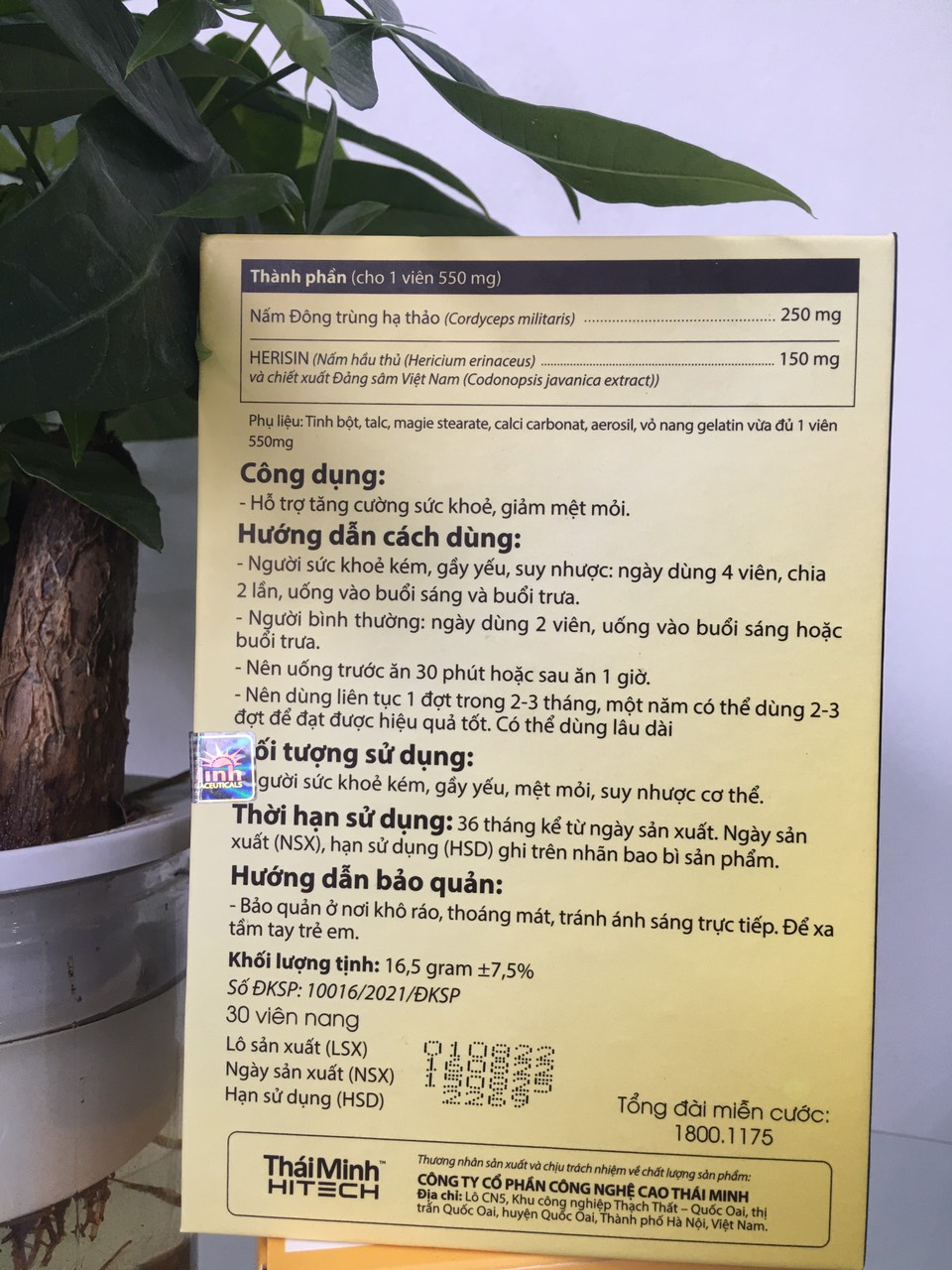 Thực phẩm bảo vệ sức khoẻ Đông trùng hạ thảo Thái Minh có thành phần từ Nấm Đông trùng hạ thảo kết hợp với chiết xuất Herisin từ Nấm hầu thủ và Đảng sâm Việt Nam giúp hỗ trợ tăng cường sức khoẻ, hỗ trợ giảm mệt mỏi. Thành phần cấu tạo cho 1 viên 550 mg: Nấm Đông trùng hạ thảo (Cordyceps militaris) 250 mg HERISIN (Nấm hầu thủ (Hericium erinaceus) và chiết xuất Đảng sâm Việt Nam (Codonopsis javanica extract)) 150 mg Phụ liệu: Tinh bột, talc, magie stearate, calci carbonat, aerosil, vỏ nang gelatin vừa đủ 1 viên 550 mg. Công dụng: Giúp hỗ trợ tăng cường sức khoẻ, hỗ trợ giảm mệt mỏi. Đối tượng sử dụng: Dùng cho người sức khoẻ kém, gầy yếu, mệt mỏi, suy nhược cơ thể. Cách dùng: