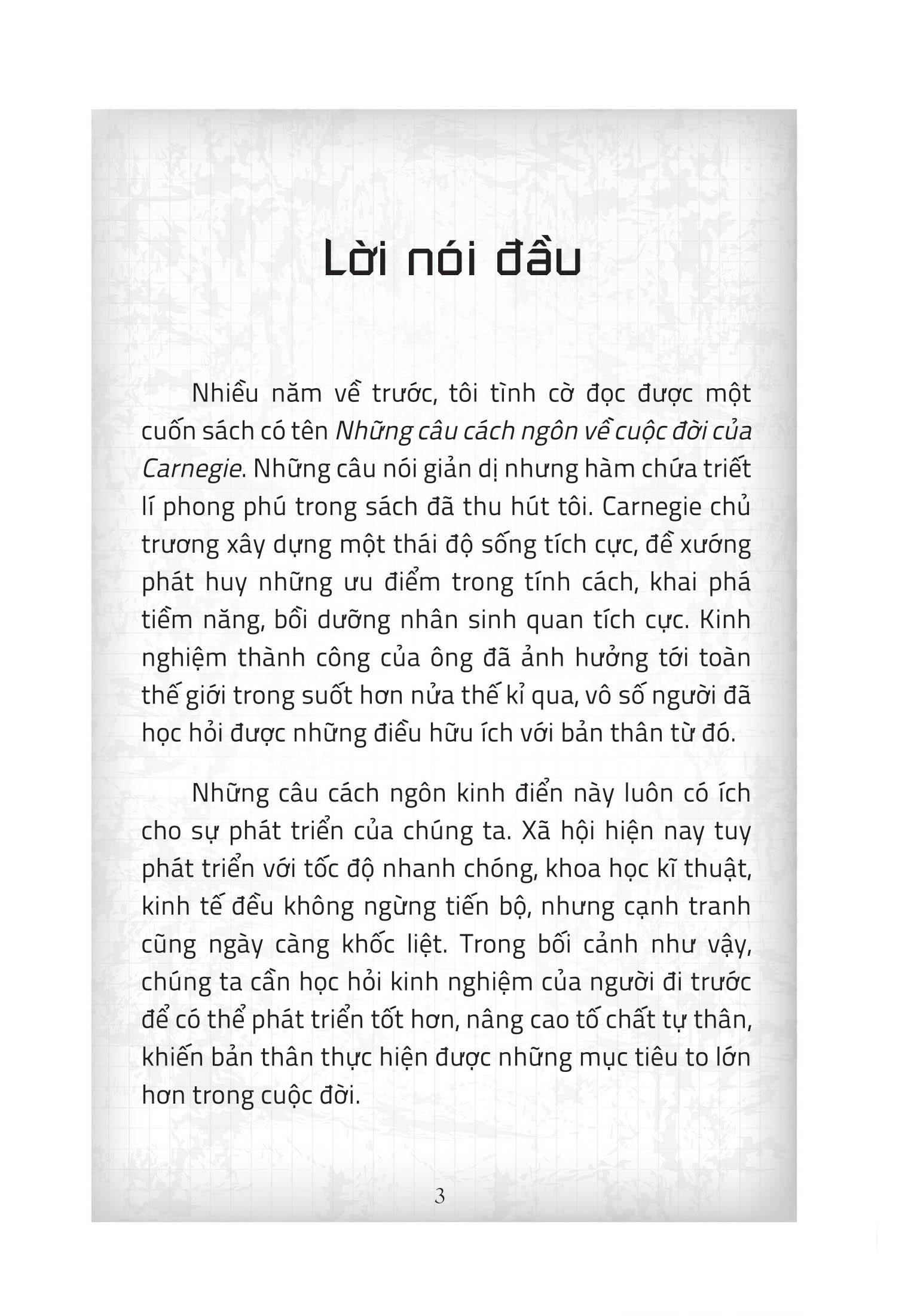 Nhiều năm về trước, tôi tình cờ đọc được một cuốn sách có tên Những câu cách ngôn về cuộc đời của Carnegie. Những câu nói giản dị nhưng hàm chứa triết lí phong phú trong sách đã thu hút tôi. Carnegie chủ trương xây dựng một thái độ sống tích cực, đề xướng phát huy những ưu điểm trong tính cách, khai phá tiềm năng, bồi dưỡng nhân sinh quan tích cực. Kinh nghiệm thành công của ông đã ảnh hưởng tới toàn thế giới trong suốt hơn nửa thế kỉ qua, vô số người đã học hỏi được những điều hữu ích với bản thân từ đó. Những câu cách ngôn kinh điển này luôn có ích cho sự phát triển của chúng ta. Xã hội hiện nay tuy phát triển với tốc độ nhanh chóng, khoa học kĩ thuật, kinh tế đều không ngừng tiến bộ, nhưng cạnh tranh cũng ngày càng khốc liệt.