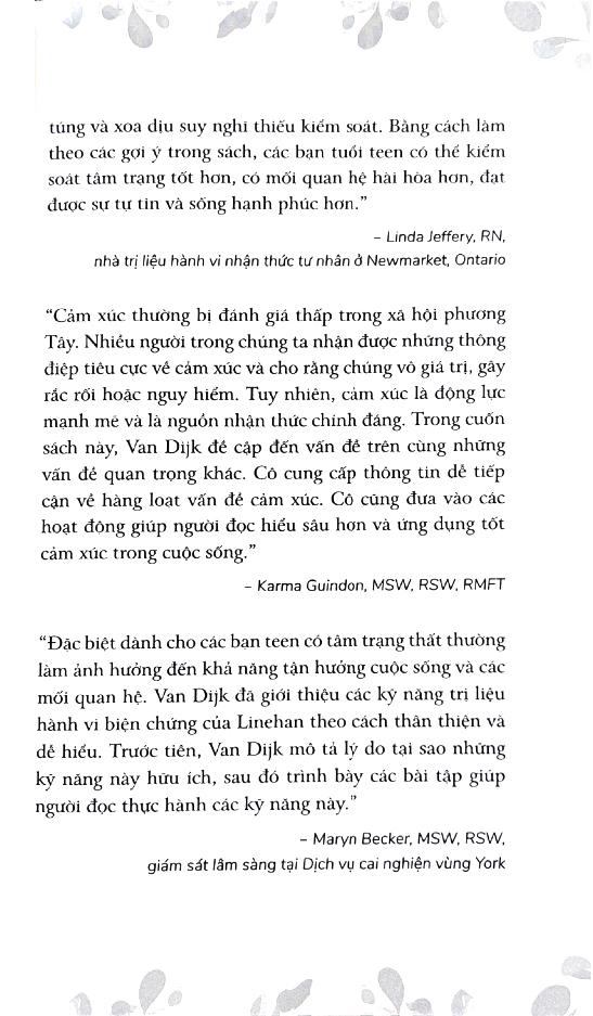 Đừng Để Cảm Xúc Điều Khiển Cuộc Đời là sách bài tập hỗ trợ các bạn trẻ tuổi teen khi rơi vào tình huống này. Bạn đọc sẽ tìm thấy trong sách những cách kiểm soát cảm xúc, giúp bạn sẵn sàng đương đầu với mọi “quả chanh” cuộc đời ném vào m.ình. Dựa trên liệu pháp hành vi biện chứng, một phương pháp trị liệu được thiết kế nhằm hỗ trợ những người gặp khó khăn trong việc xử lý những cảm xúc mãnh liệt, sách sẽ hướng dẫn bạn các kỹ năng cần thiết để vượt qua những thăng trầm trong đời với sự tự tin và duyên dáng.