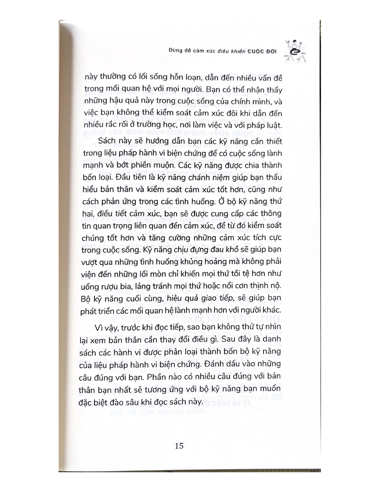 Đừng Để Cảm Xúc Điều Khiển Cuộc Đời là sách bài tập hỗ trợ các bạn trẻ tuổi teen khi rơi vào tình huống này. Bạn đọc sẽ tìm thấy trong sách những cách kiểm soát cảm xúc, giúp bạn sẵn sàng đương đầu với mọi “quả chanh” cuộc đời ném vào mình. Dựa trên liệu pháp hành vi biện chứng, một phương pháp trị liệu được thiết kế nhằm hỗ trợ những người gặp khó khăn trong việc xử lý những cảm xúc mãnh liệt, sách sẽ hướng dẫn bạn các kỹ năng cần thiết để vượt qua những thăng trầm trong đời với sự tự tin và duyên dáng.