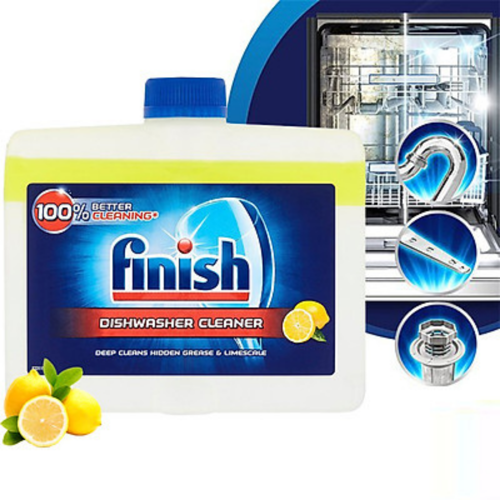 - Finish – thương hiệu rửa chén tự động được khuyên dùng bởi hầu hết các hãng máy rửa chén trên toàn thế giới. FINISH – EVERYDAY – EVERY LOVE Máy rửa chén chắc chắn là một người bạn tuyệt vời trong nhà bếp, nhưng với một máy rửa chén bẩn thì chén đĩa của bạn không bao giờ có thể sạch hoàn hảo. Theo thời gian dầu mỡ, vụn thức ăn, cặn vôi tích tụ trong máy không những tạo điều kiện cho vi khuẩn phát triển mà còn làm giảm hiệu quả hoạt động và tuổi thọ của máy. Hãy để Dung dịch tẩy rửa máy rửa chén Finish Dishwasher Cleaner Lemon giúp bạn loại bỏ hoàn toàn dầu mỡ, cặn vôi và các vết bẩn khác ngay cả các bộ phận khó tiếp cận như vòi phun, ống dẫn hoặc hệ thống sưởi để máy rửa chén của bạn lại sạch bóng như mới.