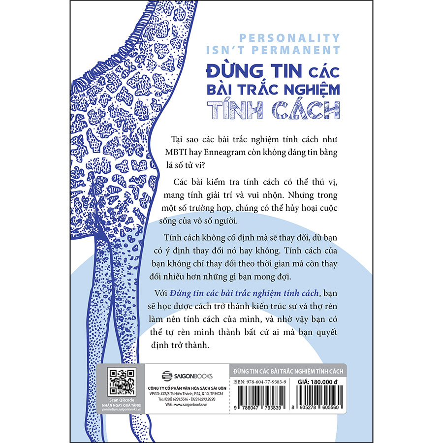 Đừng Tin Các Bài Trắc Nghiệm Tính Cách Tại sao các bài trắc nghiệm tính cách như MBTI hay Enneagram còn không đáng tin bằng lá số tử vi? Các bài kiểm tra tính cách có thể thú vị, mang tính giải trí và vui nhộn. Nhưng trong một số trường hợp, chúng có thể hủy hoại cuộc sống của vô số người. Tính cách không cố định mà sẽ thay đổi, dù bạn có ý định thay đổi nó hay không. Tính cách của bạn không chỉ thay đổi theo thời gian mà còn thay đổi nhiều hơn những gì bạn mong đợi. “Đừng tin các bài trắc nghiệm tính cách” sẽ giúp bạn: