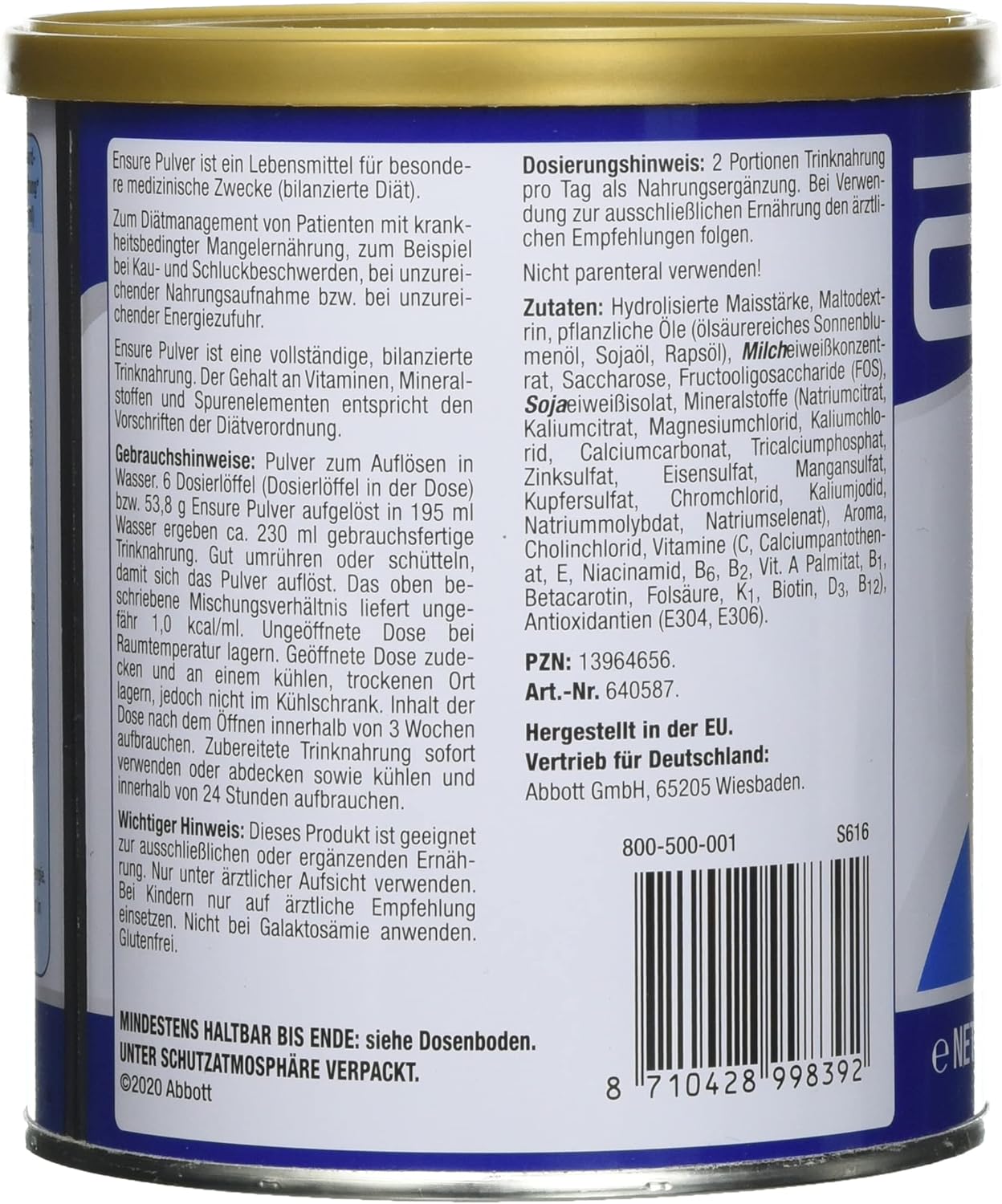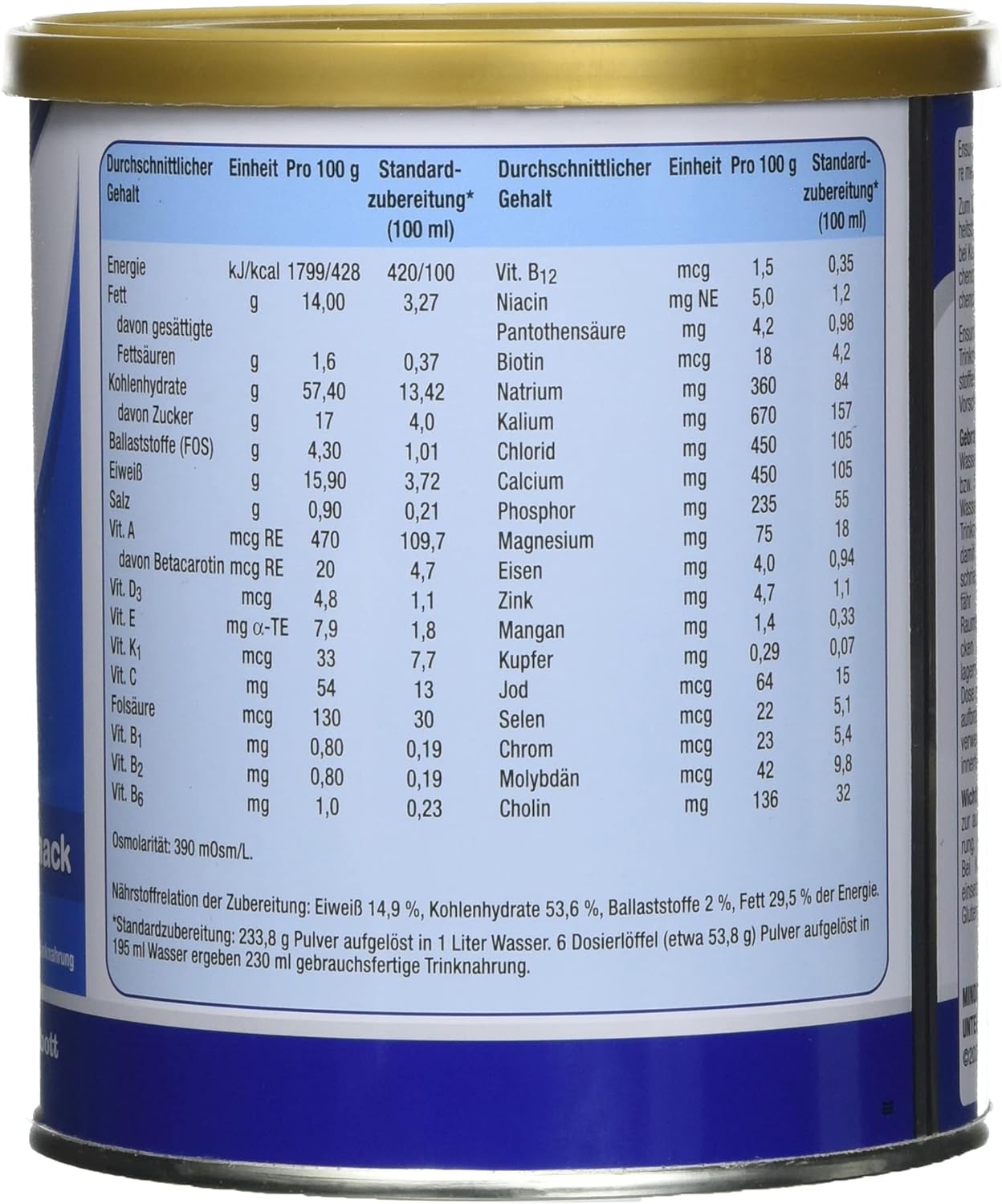 - Bảo vệ đường ruột, chống rối loạn tiêu hóa Bao bì mẫu mã thay đổi theo từng đợt nhập hàng Bao bì mẫu mã thay đổi theo từng đợt nhập hàng Thành phần Ensure Đức cho người già, người gầy yếu, suy dinh dưỡng Vanille Geschmask Protein sữa cô đặc, maltodextrin, dầu thực vật (dầu hướng dương giàu dầu, dầu đậu nành, dầu hạt cải), sucrose, fructo-oligosacarit (FOS), protein đậu nành cô lập, khoáng chất (natri citrat, kali citrat, magie clorua, kali clorua, tricalium photphat, Adfinfinfinfinfinfin, sunfat, mangan sunfat, đồng sunfat, kali iodua, natri molybdat, crom clorua, natri selenat), hương thơm, choline clorua, vitamin, (C, canxi pantothenate, E, nicotinamide, B6, B2, vitamin ). Một chất chống oxy hóa palmitate, B1, β-carotene, axit folic, K1, biotin, D3, B12): E304, E306, tinh bột ngô thủy phân. Đối tượng sử dụng