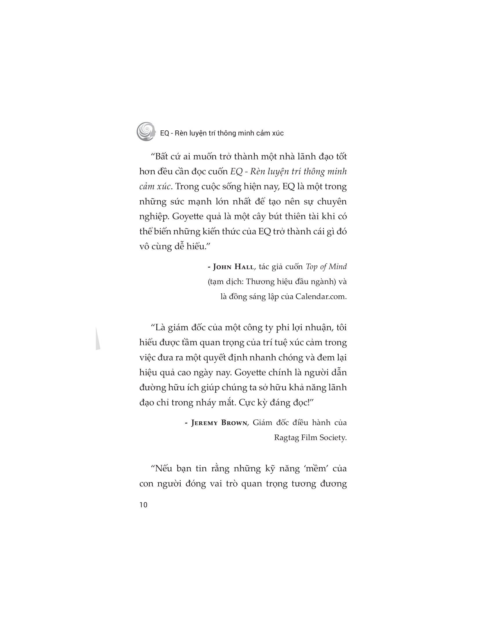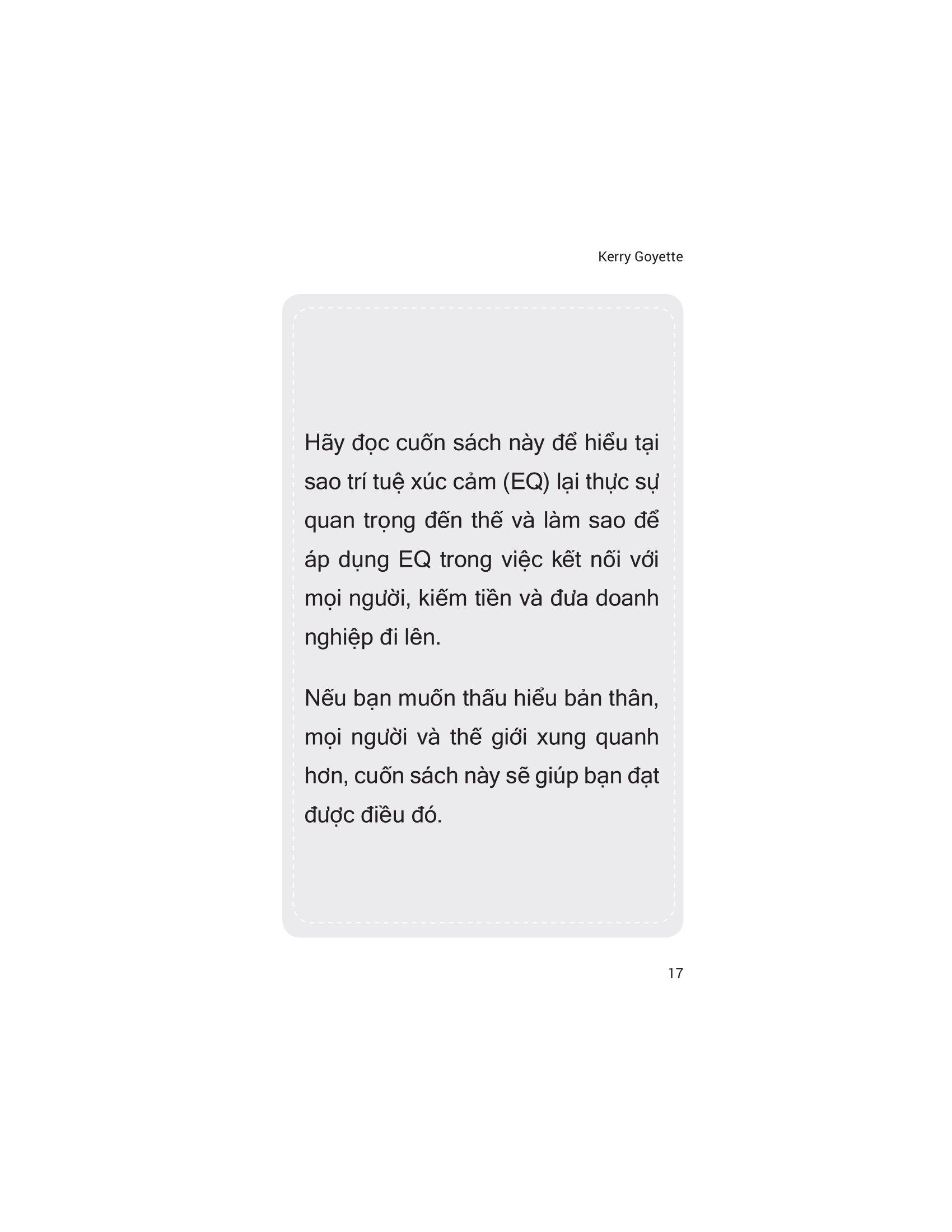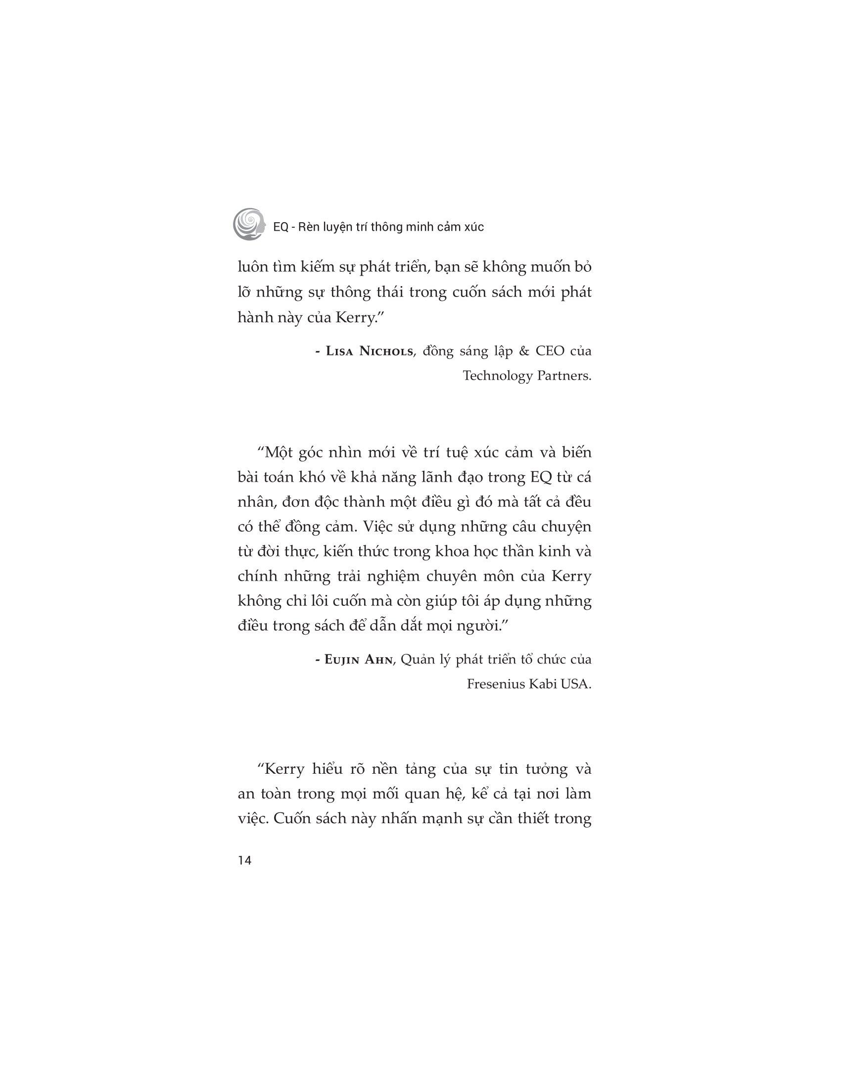 EQ - Rèn Luyện Trí Thông Minh Cảm Xúc Thế giới công việc thay đổi chóng mặt và cạnh tranh khốc liệt, với sự đe dọa của công nghệ khiến nhiều công việc truyền thống biến mất hay bị thay thế. Để tồn tại và phát triển trong môi trường như vậy đòi hỏi người lao động phải nâng cấp bản thân với những kỹ năng và năng lực mới. Trong đó, năng lực trí tuệ cảm xúc (EQ) đặc biệt được chú trọng. EQ – Trí thông minh cảm xúc là khả năng thấu hiểu bản thân, nhận thức và quản lý cảm xúc. Đó cũng là năng lực thấu cảm với cảm xúc của người khác, từ đó dẫn dắt và cân bằng các mối quan hệ. Bạn có thể tận dụng sự nhanh nhạy này để thúc đẩy các thành viên, biến động cơ cá nhân thành động lực đội nhóm. Không chỉ rèn luyện EQ cá nhân mà còn thúc đẩy EQ tổ chức. Trong cuốn sách EQ – Rèn luyện trí thông minh cảm xúc, bạn đọc sẽ tìm thấy những chỉ dẫn thực tiễn, giải trí mà vẫn hết sức sâu sắc về nguyên lý của chủ đề EQ. Bên cạnh đó là các phương pháp tận dụng trí tuệ cảm xúc để thấu hiểu bản thân, quản lý cảm xúc, thúc đẩy các mối quan hệ, từ đó đạt được nhiều thành công trong công việc và cuộc sống. Đây thực sự là một cuốn sách hữu ích với mọi người ở mọi vị trí trong công việc.