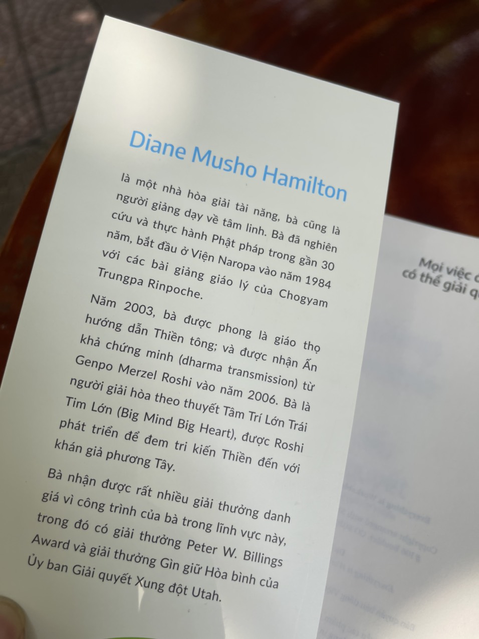 Diane Musho Hamilton là một nhà hòa giải tài năng, bà cũng là người giảng dạy về tâm linh. Bà đã nghiên cứu và thực hành Phật Pháp trong gần 30 năm, bắt đầu ở Viện Naropa vào năm 1984 với các bài giảng giáo lý của Chogyam Trungpa Rinpoche.