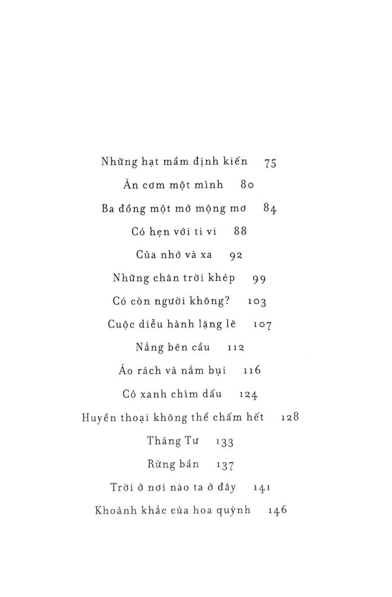 Quá khứ là kỷ niệm ấm áp, còn tương lai là những khát khao. Giữa hai miền thời gian đó, những chuyến dong ruổi, dù ngắn, qua ngóc ngách của làng quê hiện tại, đã giúp nhà văn viết nên những chi tiết hiện thực gây nhói buốt.