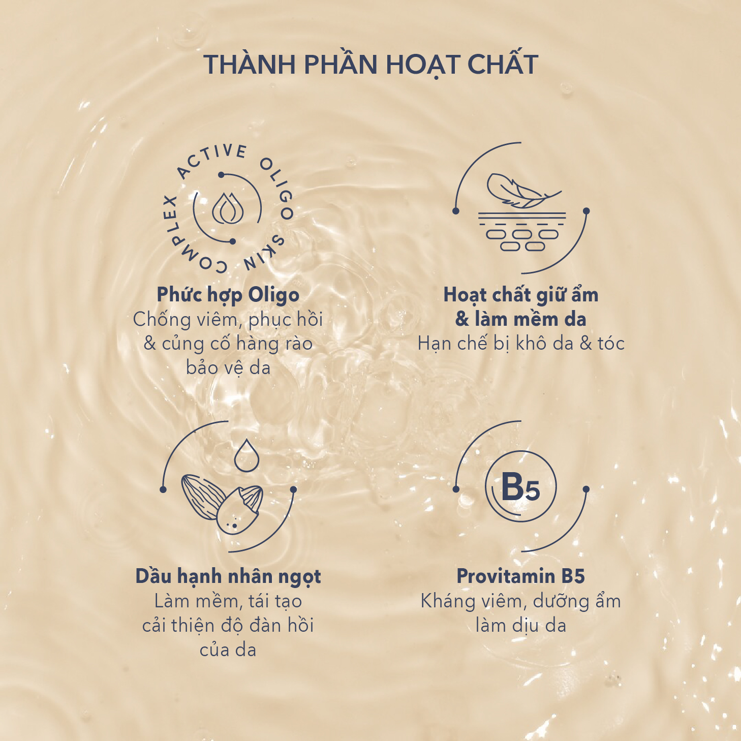 Chỉ định: Da chàm, viêm da cơ địa, dị ứng, ngứa, mẩn đỏ Cách dùng: Đỗ vài giọt vào tay và tạo bọt, nhẹ nhàng rửa sạch da mặt, da cơ thể và mái tóc. Rửa sạch