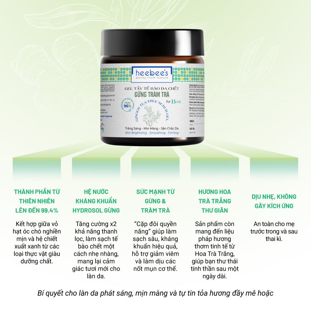 GEL TẨY DA CHẾT BODY GỪNG TRÀM TRÀ HEEBEE'S - SẠCH BỤI BẨN, SÁNG MỊN, ĐỀU MÀU, GIẢM MỤN, NGỪA VIÊM NANG LÔNG 120/200G ĐIỂM NỔI BẬT Gel Tẩy Tế Bào Chết Gừng Tràm Trà Heebee's là dòng sản phẩm chăm sóc cơ thể dịu lành và hiệu quả cho mọi làn da với công thức thuần chay an toàn. Sản phẩm chứa hệ thực vật thiên nhiên từ chiết xuất Gừng Tươi, chiết xuất Lá Tràm Trà, Cúc La Mã, Hệ Nước Chống Khuẩn Hydrosol Gừng độc đáo của Heebee's cùng với sự tham gia của thành phần Chống Oxy Hóa nổi tiếng Bisabolol giúp tăng gấp đôi hiệu quả làm sạch tế bào chết một cách nhẹ nhàng, không gây kích ứng, khô sần giúp da khỏe mạnh, sáng mịn và rạng rỡ chỉ trong một bước. Không chỉ là làm sạch, mỗi lần sử dụng còn là một lần thanh lọc – khi làn da được làm mới, tinh thần được thư giãn trong hương thơm dịu nhẹ từ tinh dầu hoa trà trắng thiên nhiên. Không gây khô rát, không nhờn rít, an toàn cho các làn da nhạy cảm, thai phụ trước và sau sinh – mang lại sự mềm mại, khỏe khoắn và cảm giác dễ chịu. THÀNH PHẦN CHÍNH CÔNG DỤNG NỔI BẬT ‣ Loại bỏ tế bào chết, dầu nhờn, độc tố; làm sạch hoàn toàn chất bẩn ẩn dưới lỗ chân lông. ‣ Loại bỏ tình trạng bít tắc lỗ chân lông gây viêm nang lông, giảm mụn và đốm nâu hiệu quả. ‣ Loại bỏ và ngăn hình thành hắc tố melanin dưới da, thúc đẩy tái tạo tế bào da mới. ‣ Cung cấp các dưỡng chất nuôi dưỡng và cải thiện tình trạng da khô sần, nứt nẻ, thô ráp. ‣ Khôi phục tế bào bảo vệ da bị tổn thương, hỗ trợ làm chậm quá trình lão hóa da. THÀNH PHẦN CHI TIẾT Aqua, Acrylates/Octylacrylamide Copolymer, Melaleuca Alternifolia Leaf Water, Zingiber Officinale Root Extract, Glycerin, Peg-40 Hydrogenated Castor Oil, Chamomilla Recutita Flower Extract,