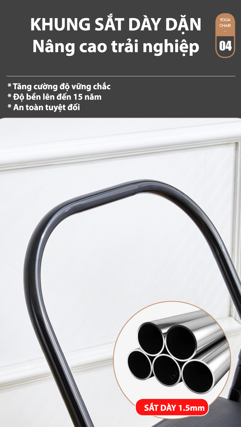 - Ngoài ra, khung sắt của toàn bộ ghế tập yoga này được sơn lớp tĩnh điện có bề mặt nhám mờ phủ bên ngoài - làm cho chiếc ghế vừa bền bỉ, chống gỉ sét tốt và sang trọng hơn.