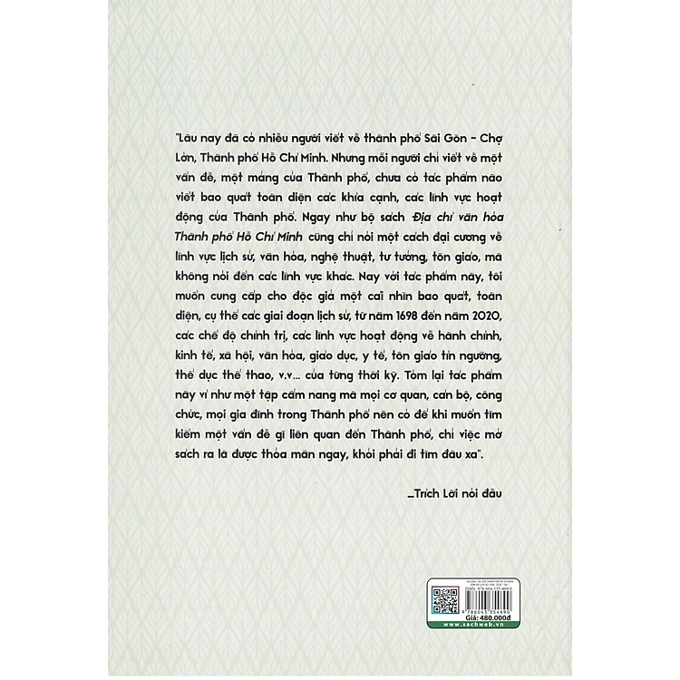 "Lâu nay đã có nhiều người viết về Thành phố Sài Gòn - Chợ Lớn, Thành Phố Hồ Chí Minh. Nhưng mỗi người chỉ viết về một vấn đề, một mảng của Thành phố, chưa có tác phẩm nào viết bao quát toàn diện các khía cạnh, các lĩnh vực hoạt động của Thành phố. Ngay như bộ sách Địa chí văn hóa Thành phố Hồ Chí Minh cũng chỉ nói một cách đại cương về lĩnh vực lịch sử, văn hóa, nghệ thuật, tư tưởng, tôn giáo, mà không nói đến các lĩnh vực khác. Nay với tác phẩm này, tôi muốn cung cấp cho độc giả một cái nhìn bao quát, toàn diện, cụ thể các giai đoạn lịch sử, từ năm 1698 đến năm 2020, các chế độ chính trị, các lĩnh vực hoạt động về hành chính, kinh tế, xã hội, văn hóa, giáo dục, y tế, tôn giáo tín ngưỡng, thể dục thể thao, của từng thời kỳ. Tóm lại tác phẩm này ví như một tập cẩm nang mang mã mọi cơ quan, cán bộ, công chức, mọi gia đình trong Thành phố nen có để khi muốn tìm kiếm một vấn đề gì liên quan đến Thành phố, chỉ việc mở sách ra là được thỏa mãn ngay, khỏi phải đi tìm đâu xa".