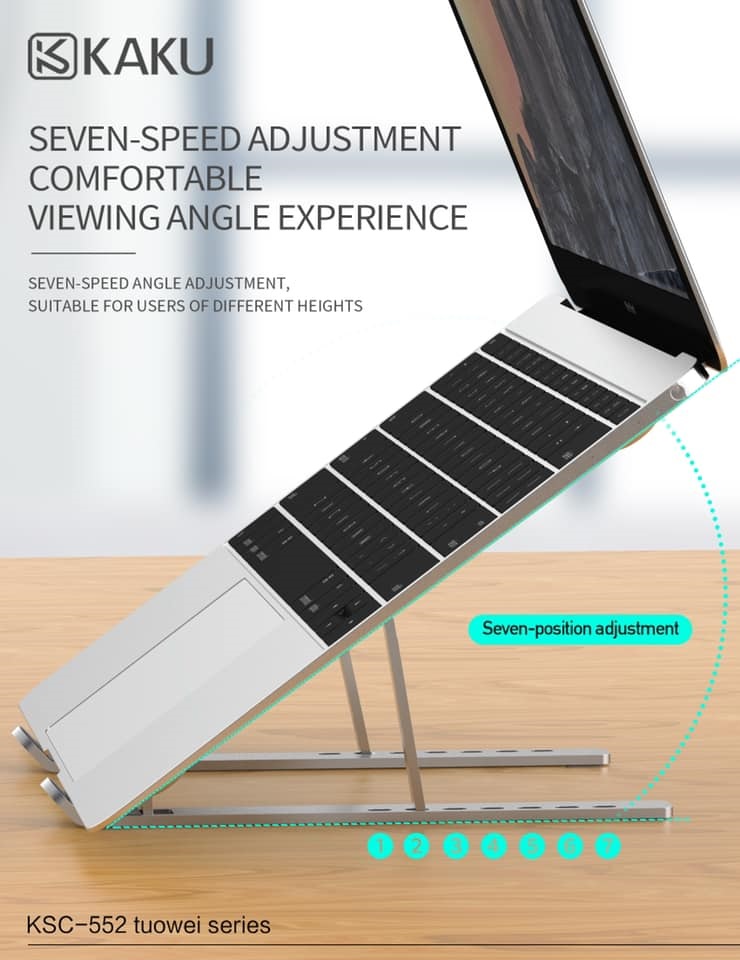 Giá đỡ đa năng KAKU dành cho Macbook iPad và các máy tính xách tay khác Chất liệu: hợp kim Nhôm (bền, đẹp, chắc chắn hơn nhựa rất nhiều) Các đầu tiếp xúc được gắn silicon êm mềm, không gây trầy xước máy Dùng để đỡ laptop các cỡ (13~15.6inch) và máy tính bảng Tương thích với hầu hết mọi Macbook/Laptop Gấp gọn khi không sử dụng có tính di động cao Linh hoạt tuỳ chỉnh độ cao theo nhiều cấp độ. Chống mỏi lưng, mỏi cổ, hạn chế các bệnh lý khi làm việc quá nhiều với máy tính. Khe thoáng giúp tản nhiệt laptop rất hiệu quả. Đệm cao su chống trơn trượt.