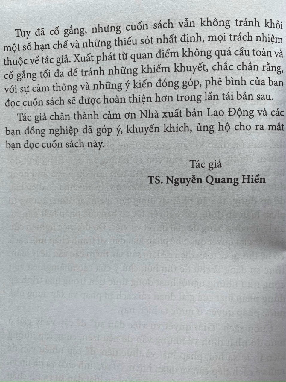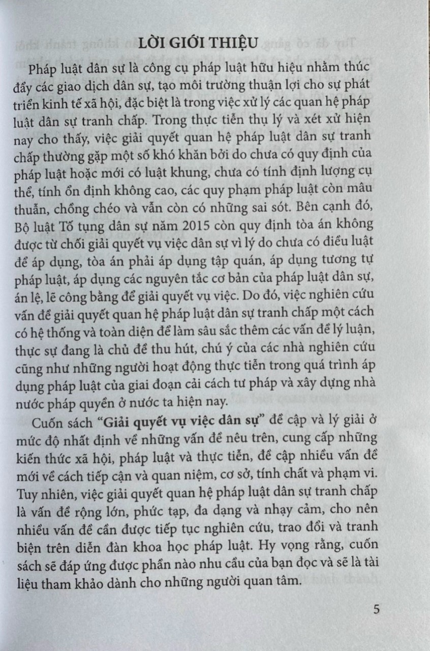 Cuốn sách “Giải quyết vụ việc dân sự” đề cập và lý giải ở mức độ nhất định về những vấn đề nêu trên, cung cấp những kiến thức xã hội, pháp luật và thực tiễn, đề cập nhiều vấn đề mới về cách tiếp cận và quan niệm, cơ sở, tính chất và phạm vi. Tuy nhiên, việc giải quyết quan hệ pháp luật dân sự tranh chấp là vấn đề rộng lớn, phức tạp, đa dạng và nhạy cảm, cho nên nhiều vấn đề cần được tiếp tục nghiên cứu, trao đổi và tranh biện trên diễn đàn khoa học pháp luật. Hy vọng rằng, cuốn sách sẽ đáp ứng được phần nào nhu cầu của bạn đọc và sẽ là tài liệu tham khảo dành cho những người quan tâm.